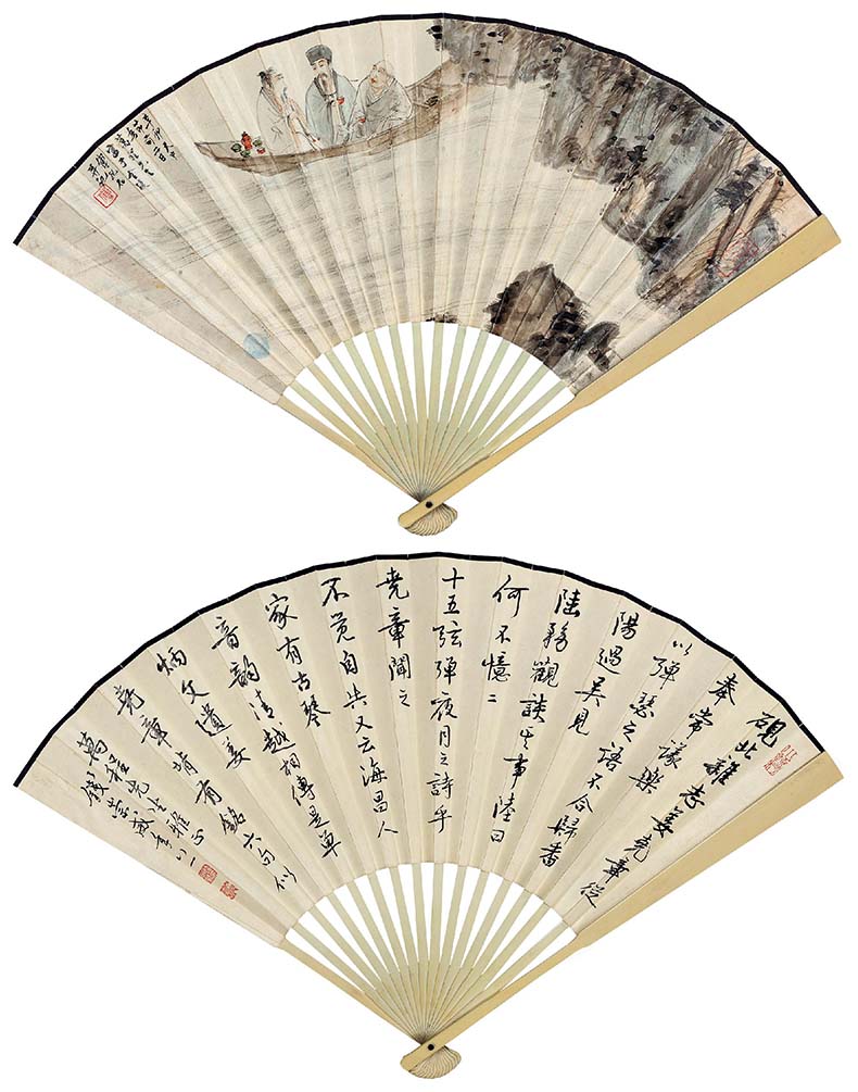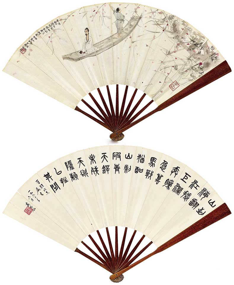 3、1962年作 泛舟图 篆书词 成扇 437.00万