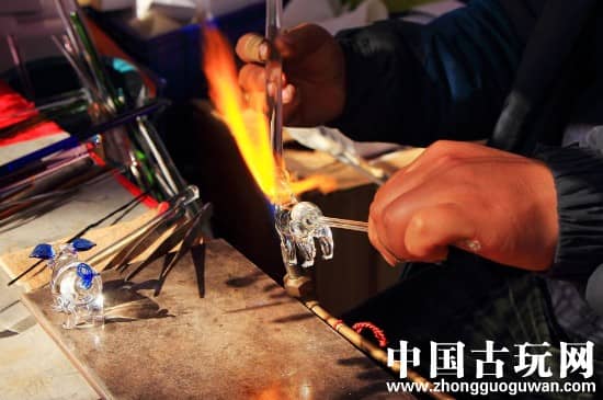 再从高温火炉中用1.5米长的吹筒中取出琉璃体,取出后,不断的旋转琉璃,给它造型。火炉温度很高,刚取出来的琉璃软化程度好,易于塑造琉璃形状,不过在造型的手法必须要快,因为琉璃会渐渐冷却。