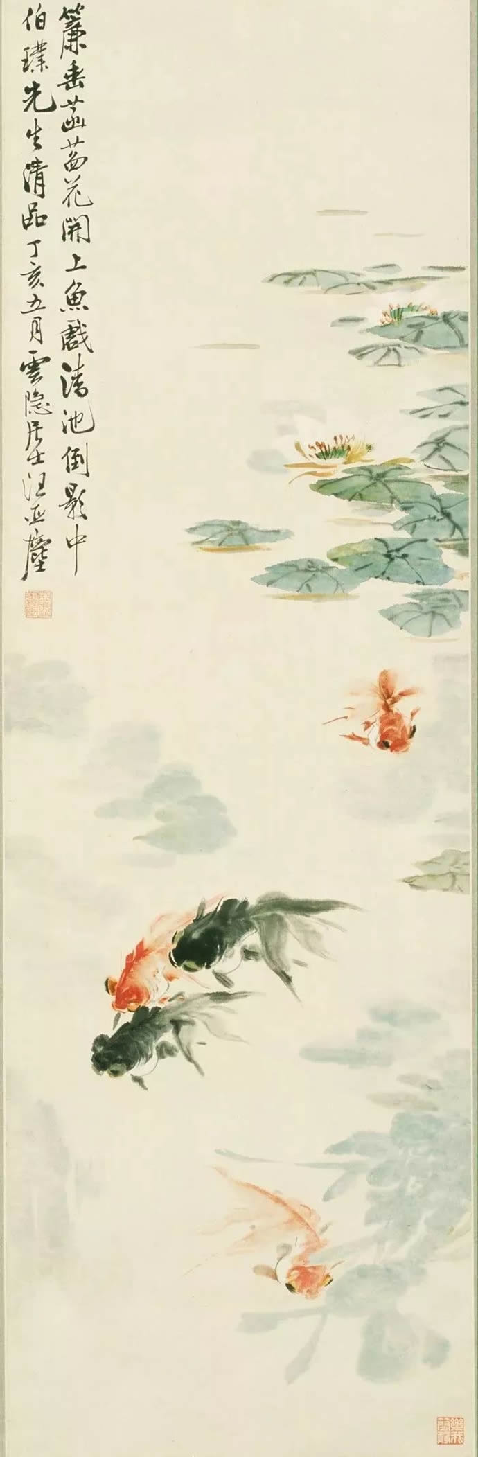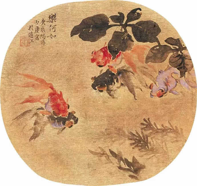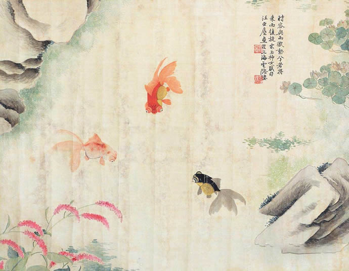 而金鱼则分别用丹朱和水墨勾写,写红鱼三条,墨鱼两尾,活灵活现,形貌传神。