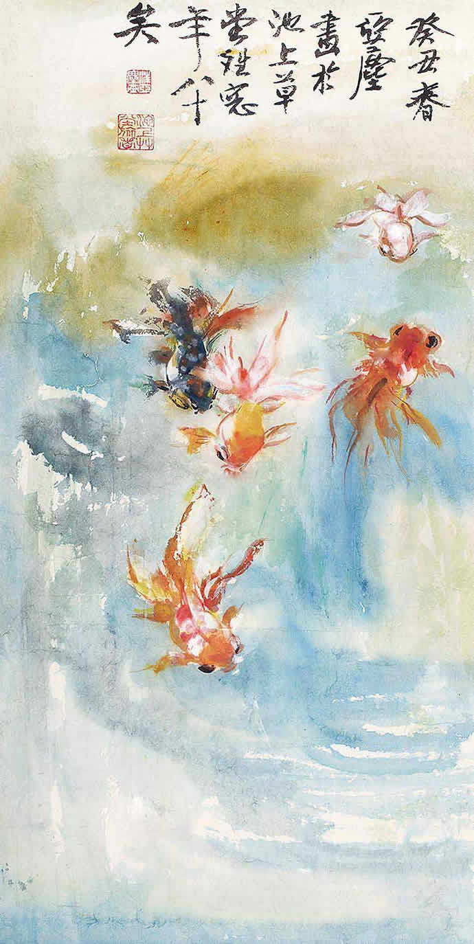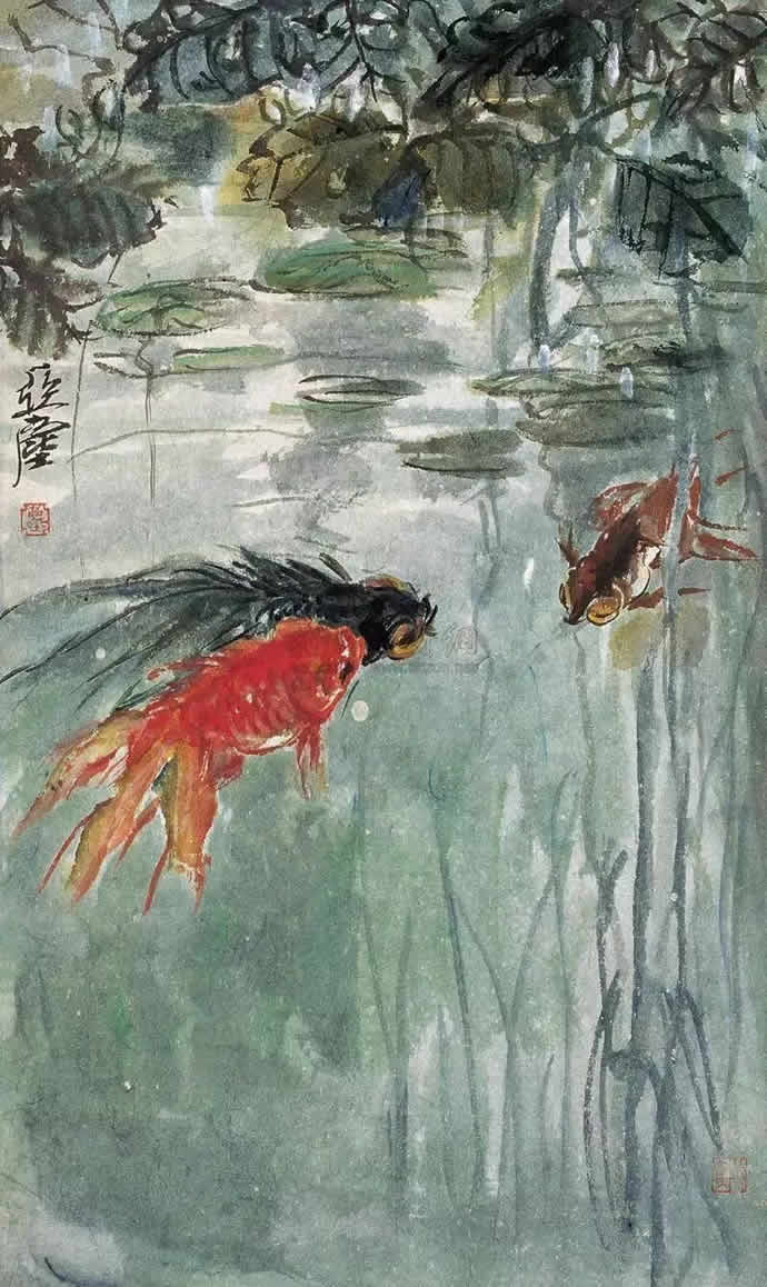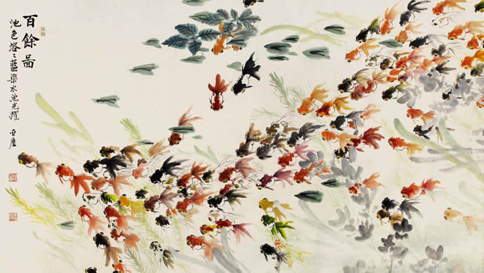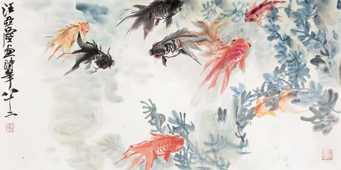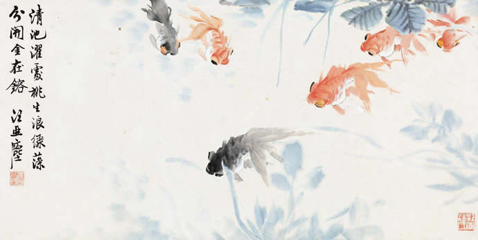 经过对金鱼生活习性、活动姿态多年的观察与研究,汪亚尘笔下的游动的鱼甚至可清晰地分出远近、高低、虚实。在墨与彩色之间宁静得体,栩栩如生,悠哉游哉、红鳞碧藻、水光尾影,达到雅俗共赏之妙。