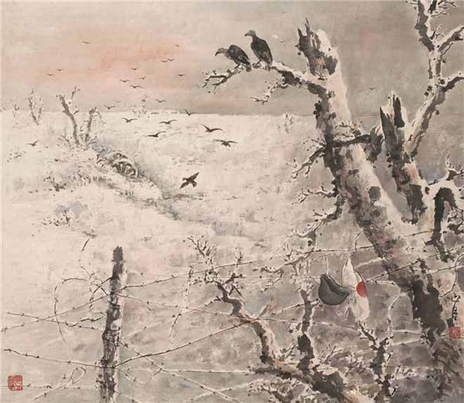 另一件完成于1940年的《侵略者的下场》描绘的是日寇覆灭的场景:前景是枯折的树干、交错的铁蒺藜,中景是深厚的积雪、倾轧的轮车,远景是象征死亡的乌鸦和泛着血色的天空——带刺钢丝网上悬着的钢盔和“红膏药”旗以一种暗示的手法成为画面的中心。关山月的出色之处在于策略性地把一些具备象征意义的图像元素——也是他擅长的元素——比如雪景、枯枝、天空,安排在一个方形平面里。对他而言,处理一顶帽子、枯折的树干比处理一个士兵、敌人更有经验。画面的视觉结构是去经验化和反叙事的,因此,激活了作品的开放性,多变而成熟的手法使关山月比之前任何时候都更像一位独立思考的画家。