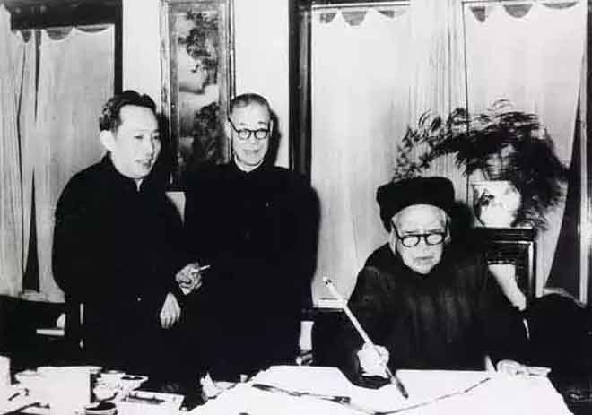 1962年,傅抱石、潘天寿在杭州观看何香凝作画