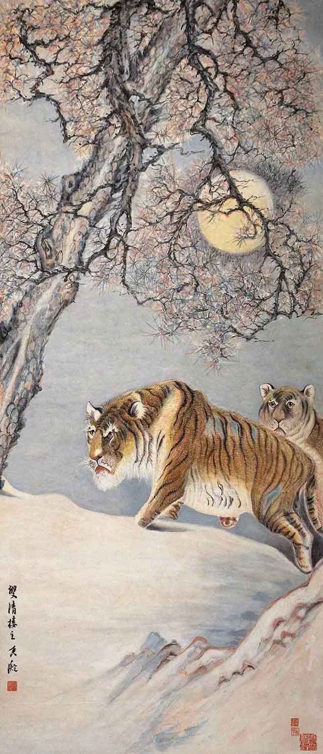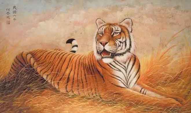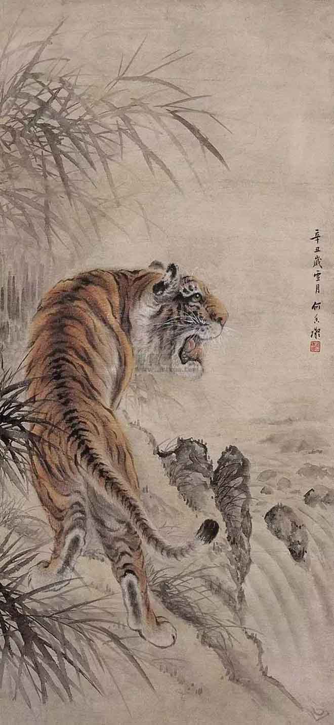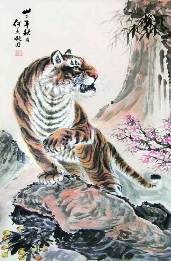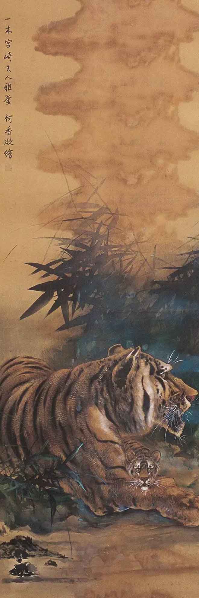 何香凝早期作品有浓厚的日本画风格,她以梅花和老虎为题材的绘画作品享誉海内外。她擅画山水,花卉,尤工狮、虎、鹿、鹤等动物。笔致圆浑细腻,色彩古艳雅逸,意态生动。著有《何香凝诗画集》。