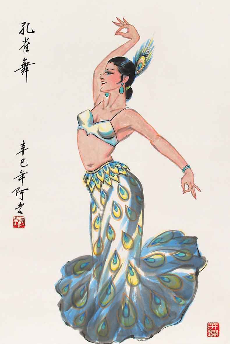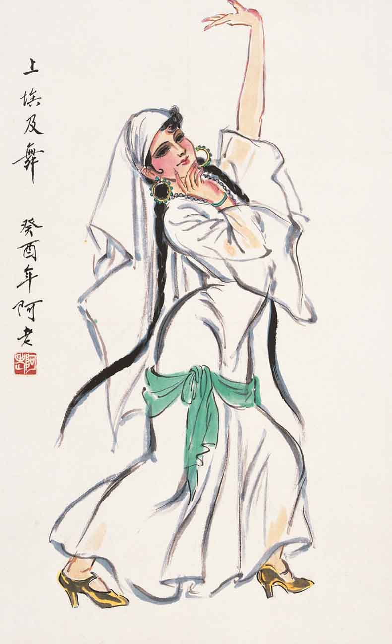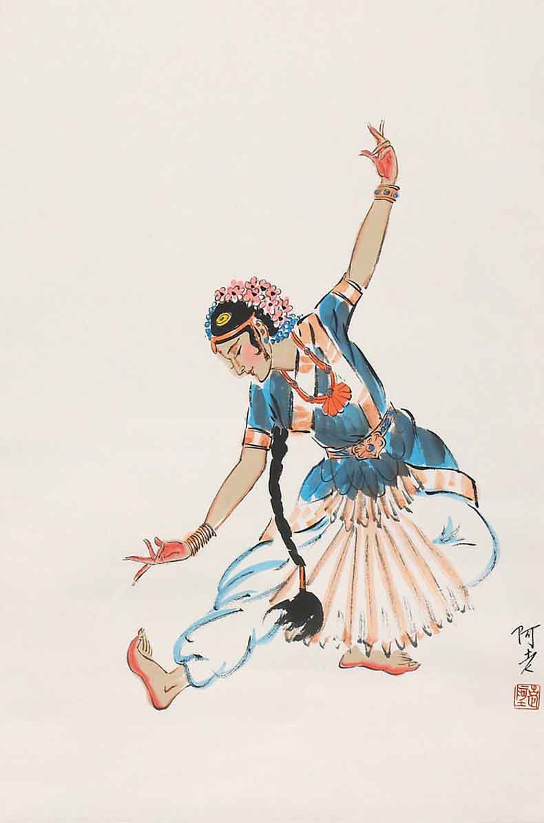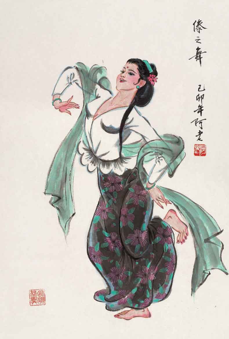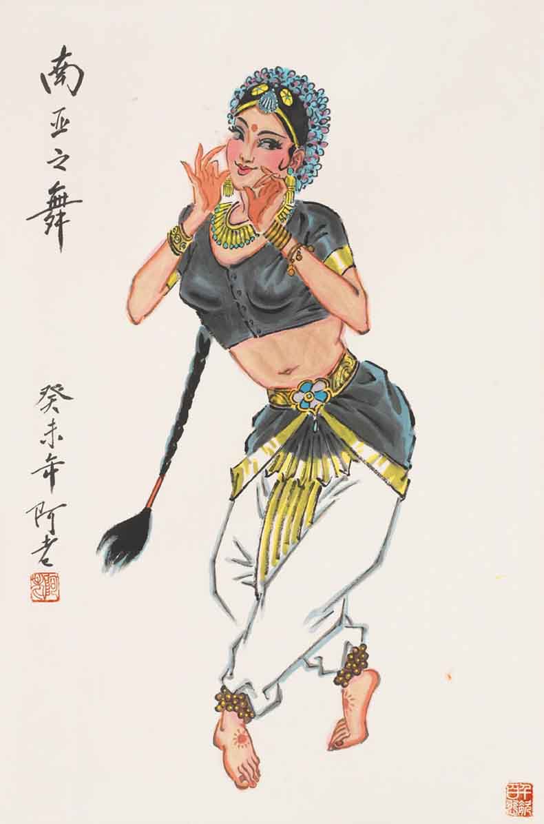 阿老(1920-),原名老宪洪。广东顺德人。当代著名画家,尤以舞蹈人物速写名世。其舞蹈人物画造型准确、洗练,线条娴熟流畅,善以音乐韵律感融入彩墨中,表现了不同的民族个性与庄重典雅柔美的气质。历任北京艺术学院、北京艺术师范学院副教授,中央工艺美术学院副教授、教授、副院长。