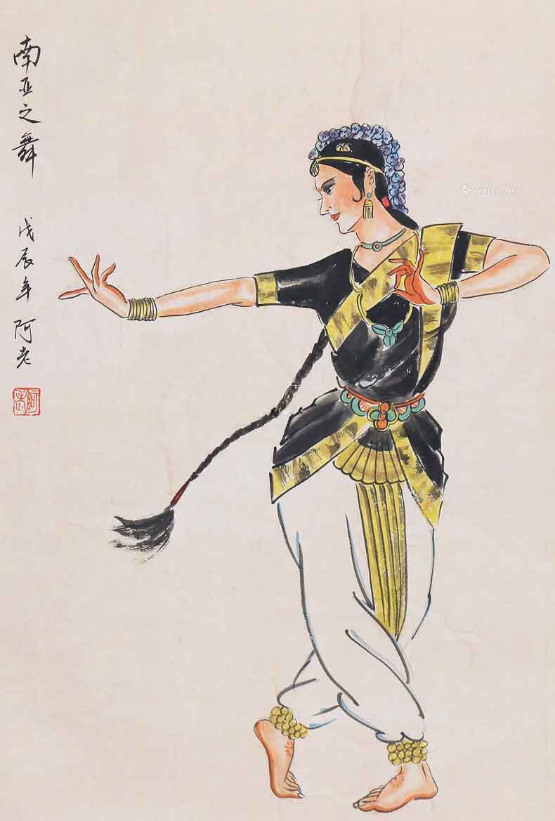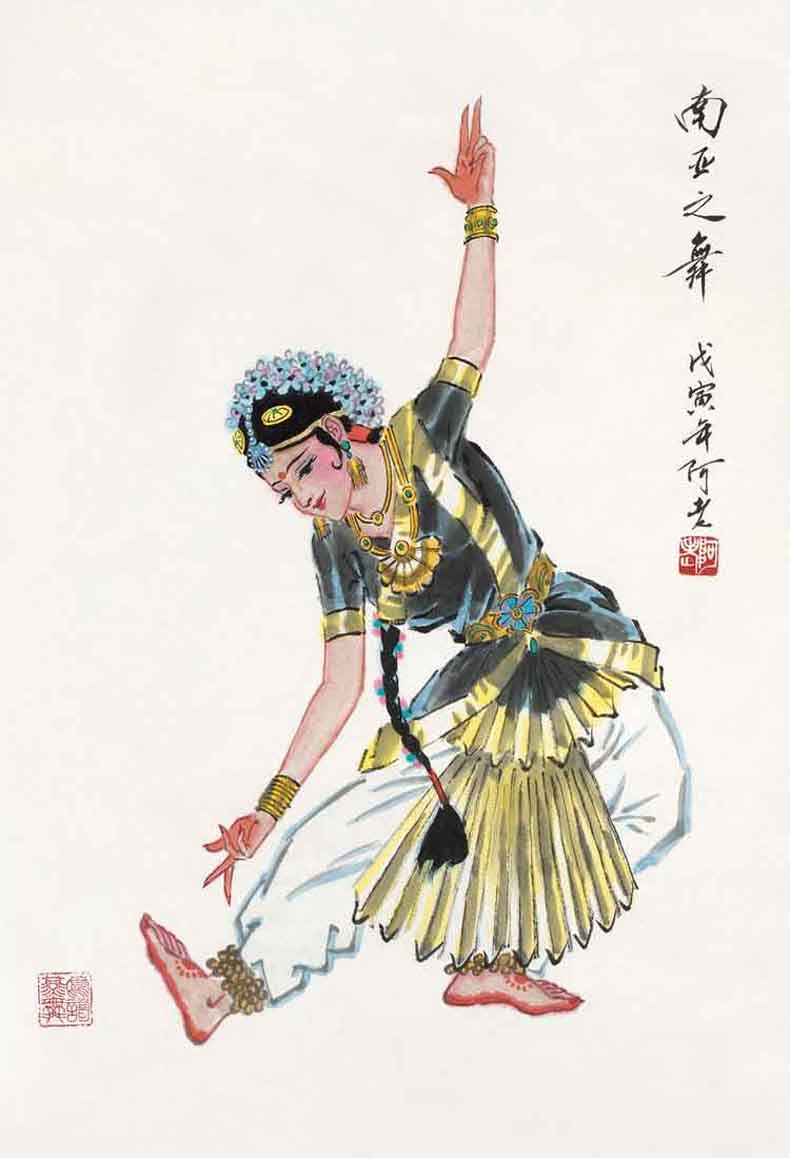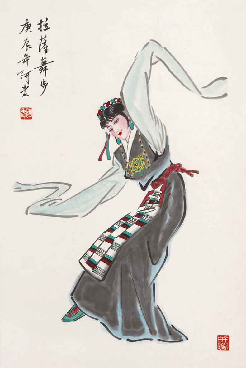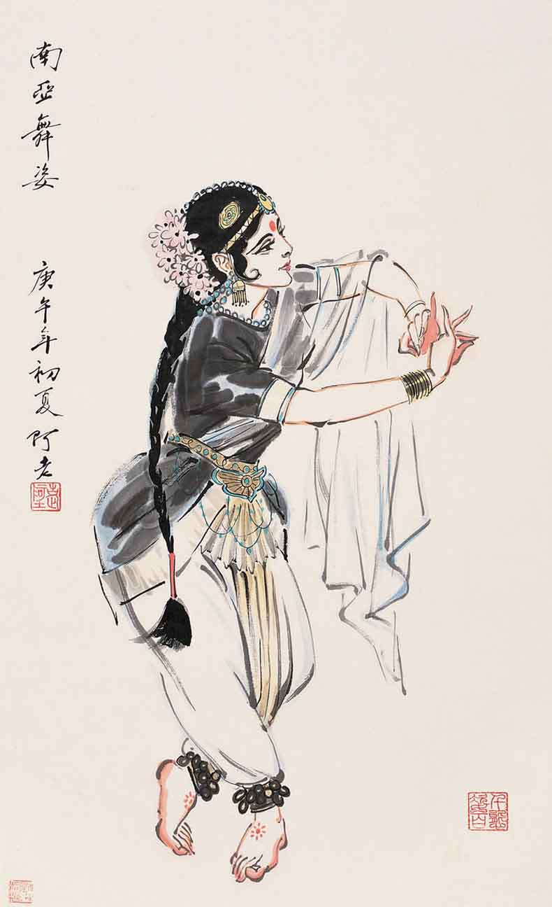 阿老(1920-),原名老宪洪。广东顺德人。当代著名画家,尤以舞蹈人物速写名世。其舞蹈人物画造型准确、洗练,线条娴熟流畅,善以音乐韵律感融入彩墨中,表现了不同的民族个性与庄重典雅柔美的气质。历任北京艺术学院、北京艺术师范学院副教授,中央工艺美术学院副教授、教授、副院长。