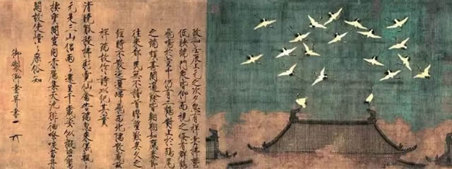 他画的《瑞鹤图》中,彩云缭绕在汴梁宣德门,天空中有十八只丹顶鹤在盘旋,另有两鹤立于鸱尾之上,交相呼应。每一只鹤都姿态各异,无一雷同,但都灵动精妙,仿佛呼之欲出。而且构图奇特,让群鹤高翔,布满天空,气势庄严,瑞祥自现。