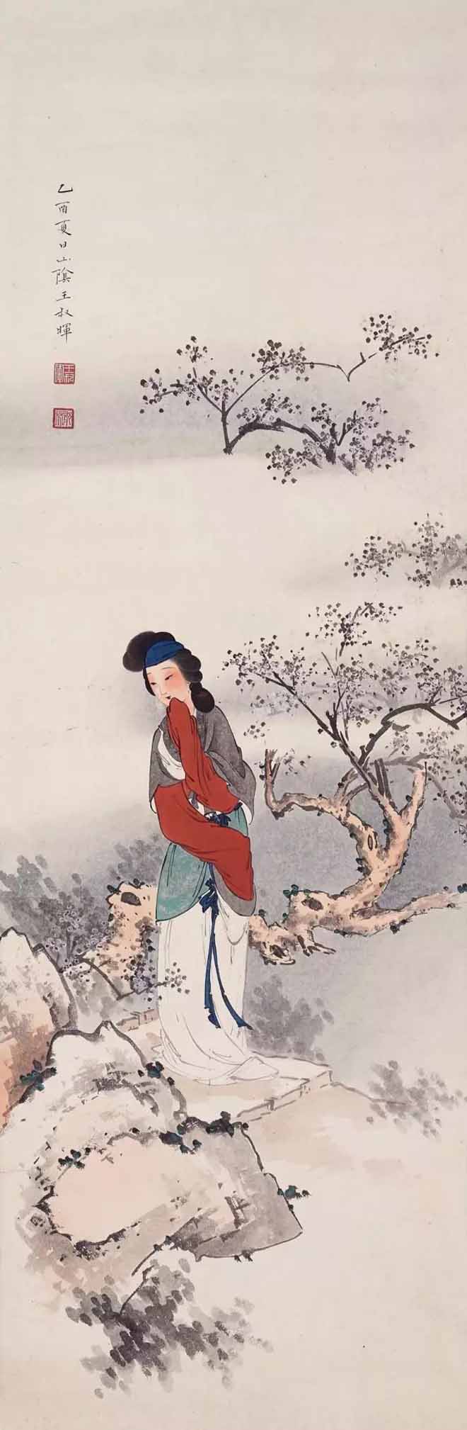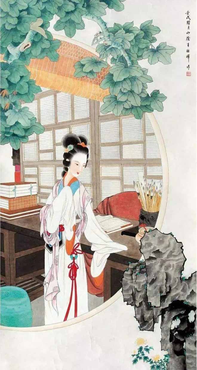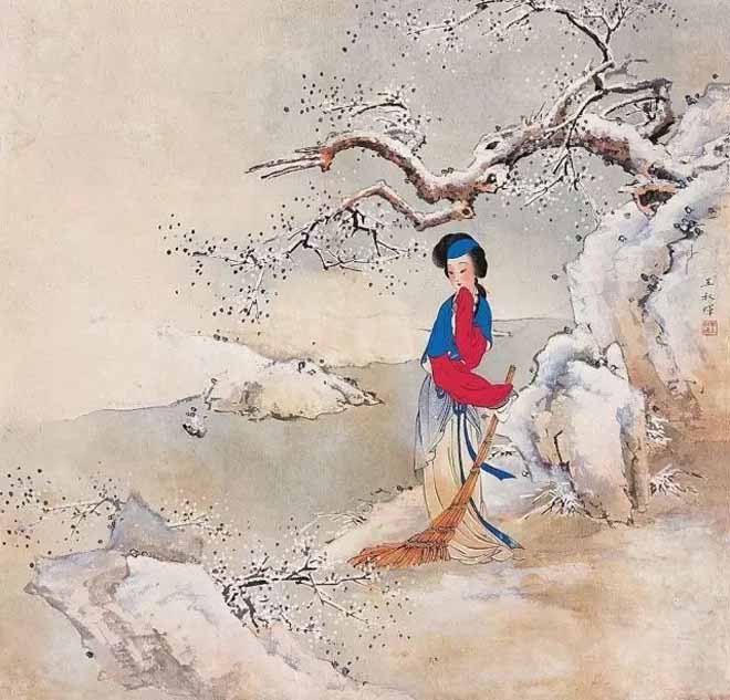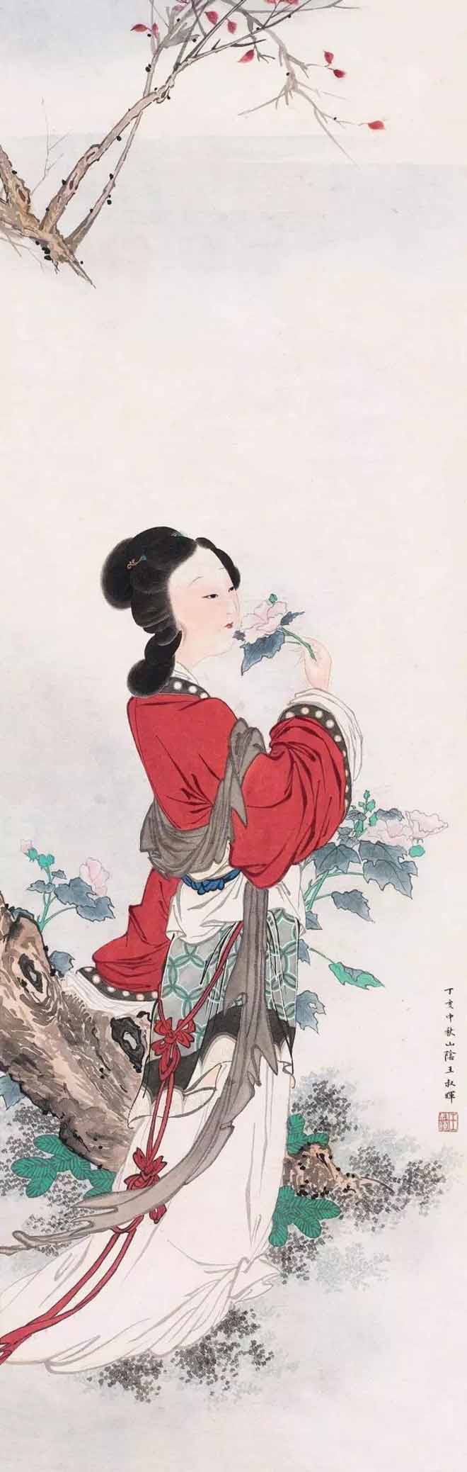 1978年初,王叔晖开始闭门谢客,潜心琢磨黛玉这一形象。她自定目标:10年内一定画完红楼十二钗。8年间,继黛玉之后,王叔晖陆续画了湘云、宝钗、凤姐、李纨、迎春、元春、惜春等,此外还创作了两幅宝琴立雪。孰料,《惜春作画》竟成绝笔,画未终,人先去,绵绵红楼情愫,未得尽意挥之笔端,留下了永久的遗憾!