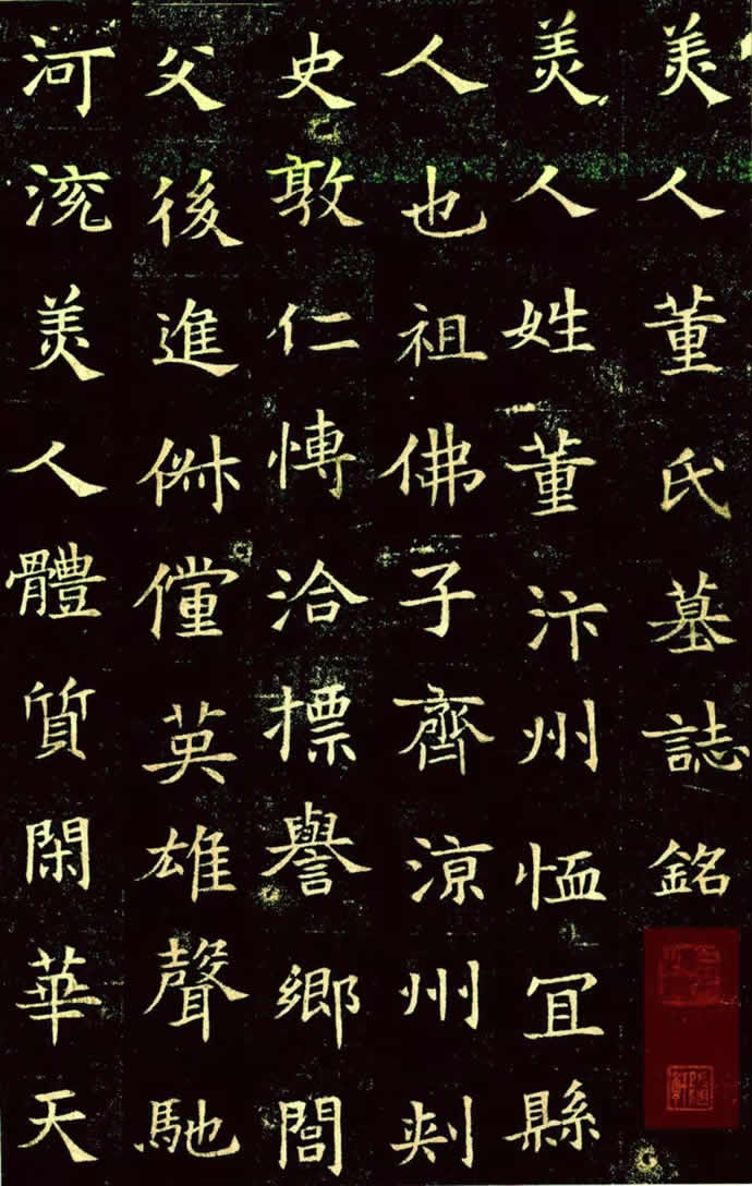 追思董美人生平事迹的随葬刻石。董美人(公元578年公元597年),隋文帝四子蜀王杨秀的妃妾。董氏于开皇十七年病逝,终年十九岁。此碑书法上承清新秀丽,起到上承魏碑,下启唐楷的重要作用。