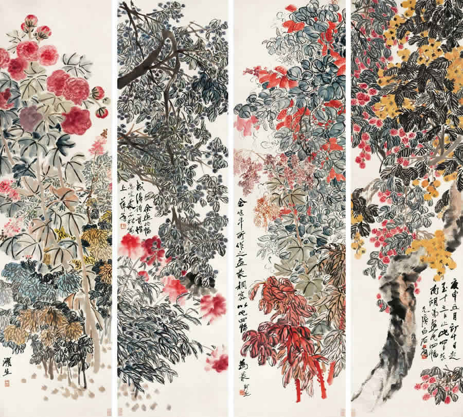 为了抱得美人归,齐白石可用心了,也舍得花血本,而且一画就是四幅条屏,每幅近8平尺,四屏就是32平尺。这对齐白石来说不仅是巨作,而且也很罕见。