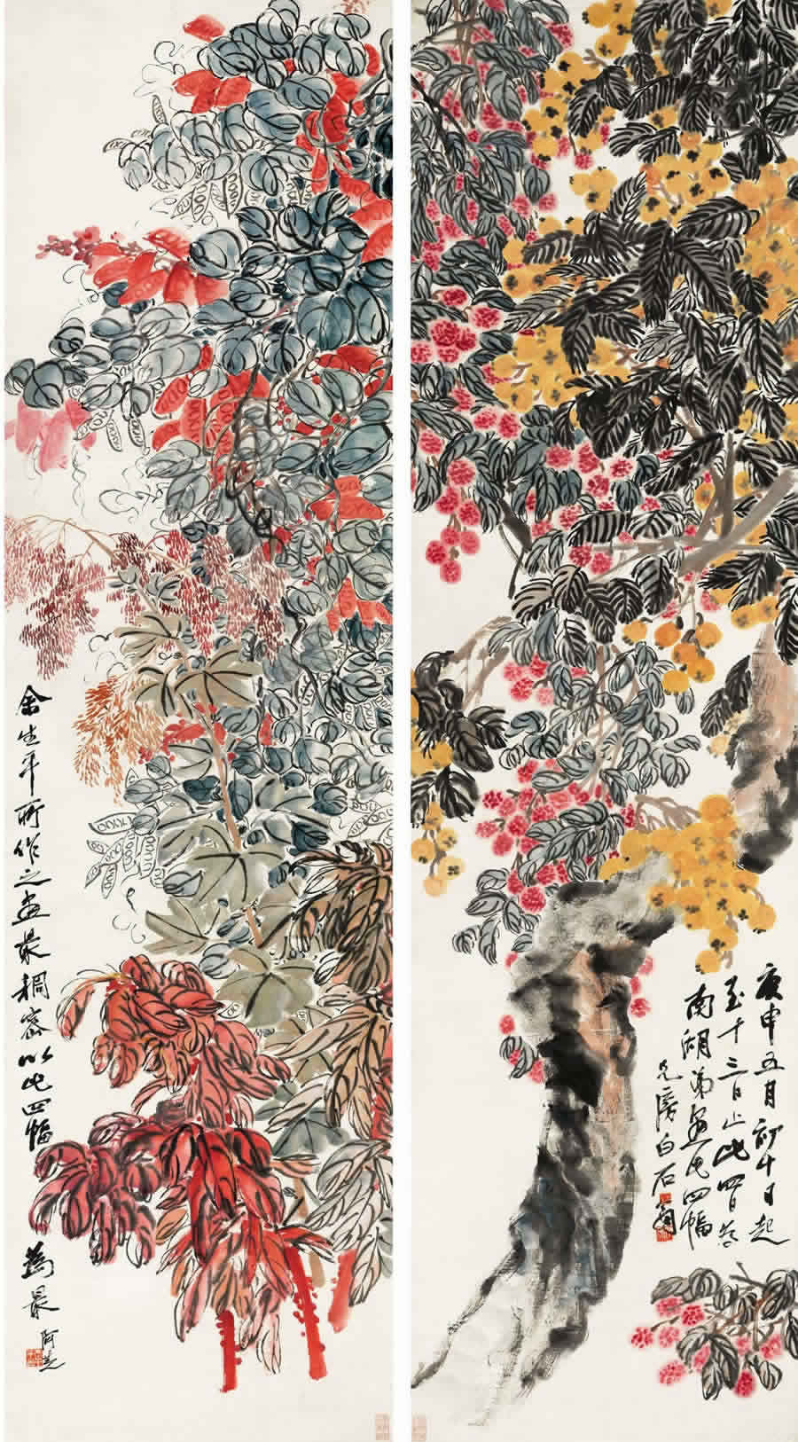 这幅画名叫《福祚繁华》,可不简单,画面很俗很艳很茂密。齐白石自称是“余生平所作之画最稠密,以此四幅为最。”因为画的都是枇杷、荔枝,豆荚、老少年、牡丹、芙蓉、桂树、金菊等吉祥花果,代表着富贵大利、长寿多子、福祚绵延等吉祥寓意。整个画面密密麻麻,红红火火。