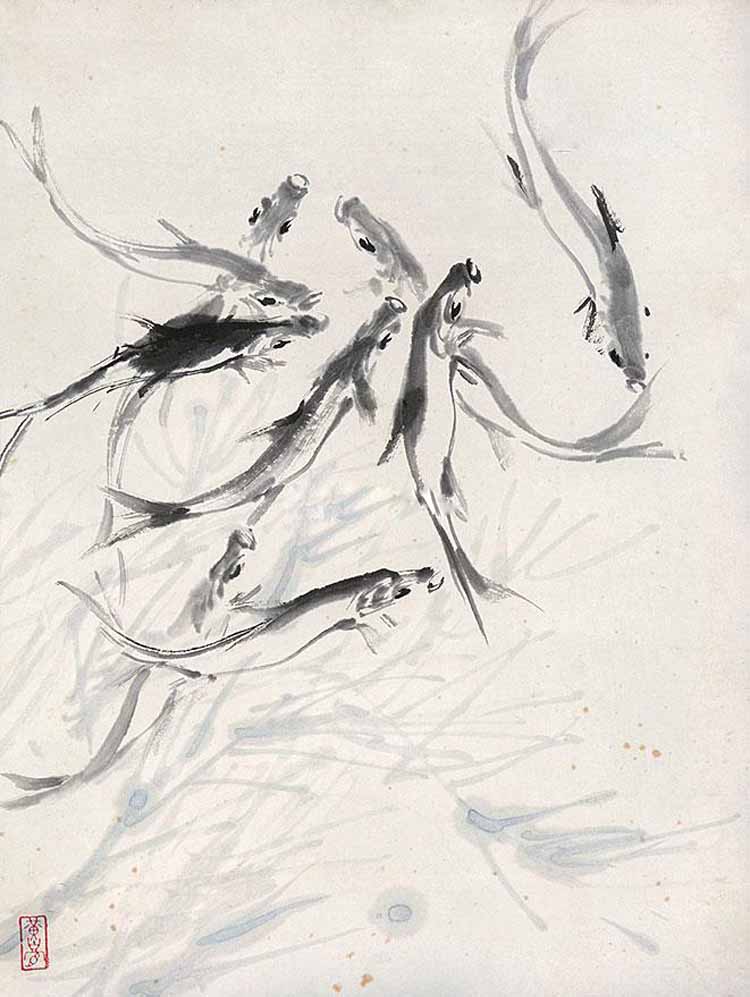 黄胄曾说:“画鱼如果鳞尾须目笔笔无不精工描画,难于表现在水中游动的感觉,亦不可像摄影一样形象逼真。”黄胄以速写笔法画鱼,别有韵致。
