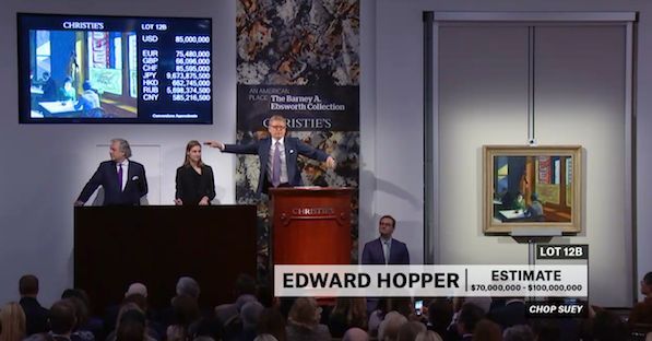 出自该珍藏的美国艺术家爱德华·霍普的经典作品《中餐厅(杂碎)》作为私人收藏中最重要的霍普作品,以近9200万美元的成交价成为晚间拍卖最高价拍品,折合人民币6.672亿元。不仅创下艺术家的拍卖世界纪录,亦成为拍卖史上最贵的战前美国艺术品。