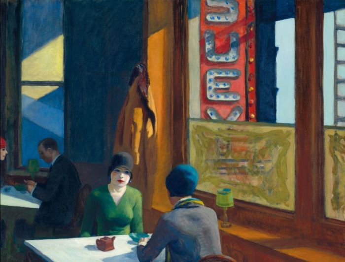 该作取名自当时美国中餐馆最常用的名字“杂碎”,作品描绘了霍普曾经常光顾的一家位于纽约上西区的餐厅,通过对灯光和色彩的巧妙运用,将人物的靠近与疏离包裹在光影明暗中,再现了当时纽约的时代思潮。