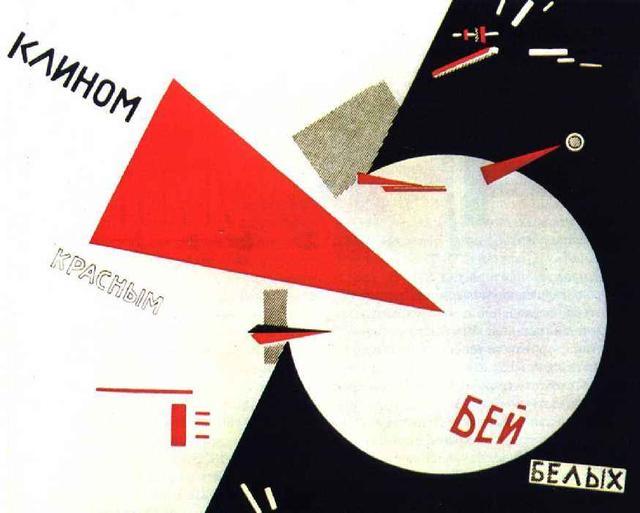 与塔特林一样,利西茨基主张艺术要适应社会在实用上和思想上的需要。他的许多纯属抽象构成的画作不仅面貌独特,而且均包含着丰富的文学性和象征性内涵,有的甚至明显具有政治宣传的色彩。如作于1919年的招贴画《以红色楔子挤入白色》,展示的完全是一个抽象画面,但却寓有鲜明的政治含义。