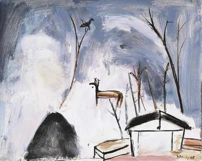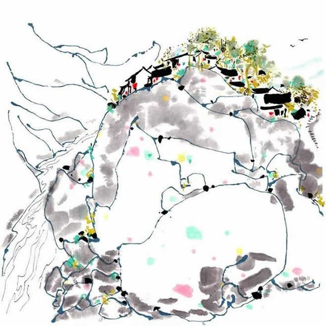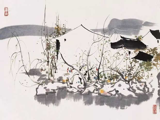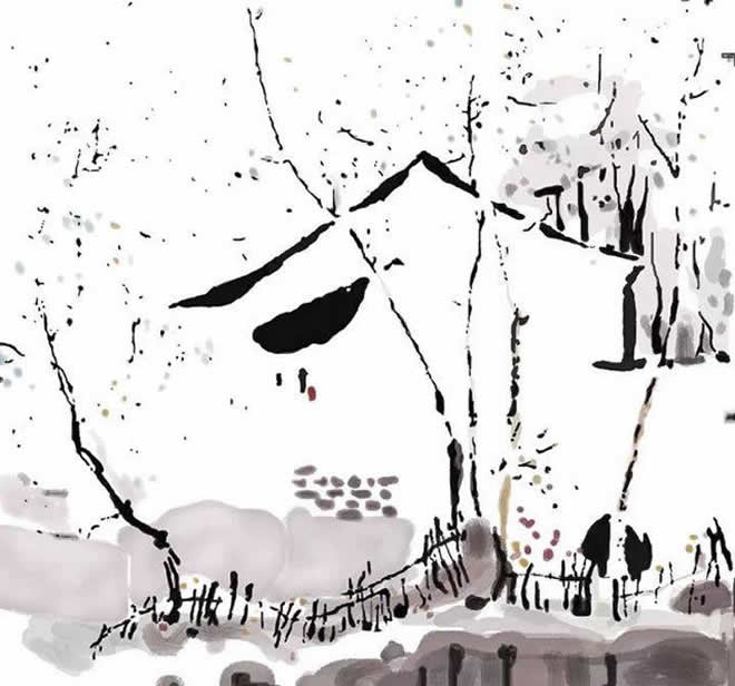 到了中期,出现两个极端,要么笔墨越来越少,用大片的留白来勾勒一个模样,甚至用几点来表示一个房屋,要么用极大的黑色块来画一个房子。