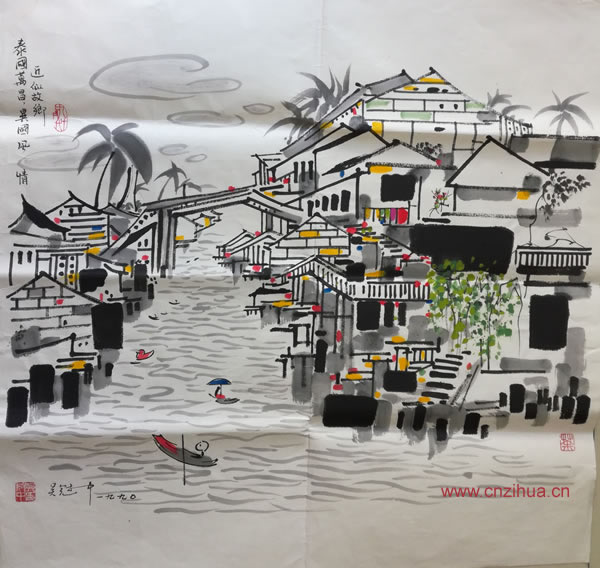 设色纸本。70×70cm。题识:泰国万昌,异国风情,近似故乡,吴冠中一九九○年。钤印:吴冠中印、九十年代、荼。