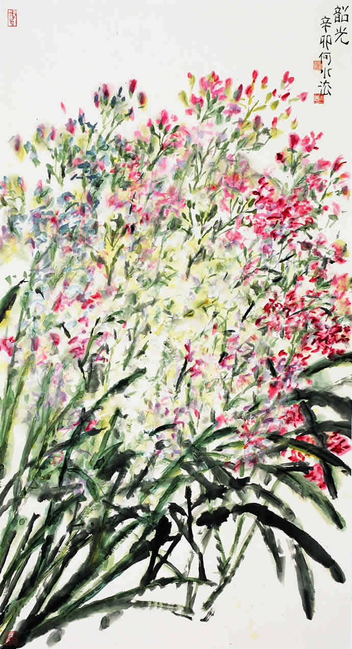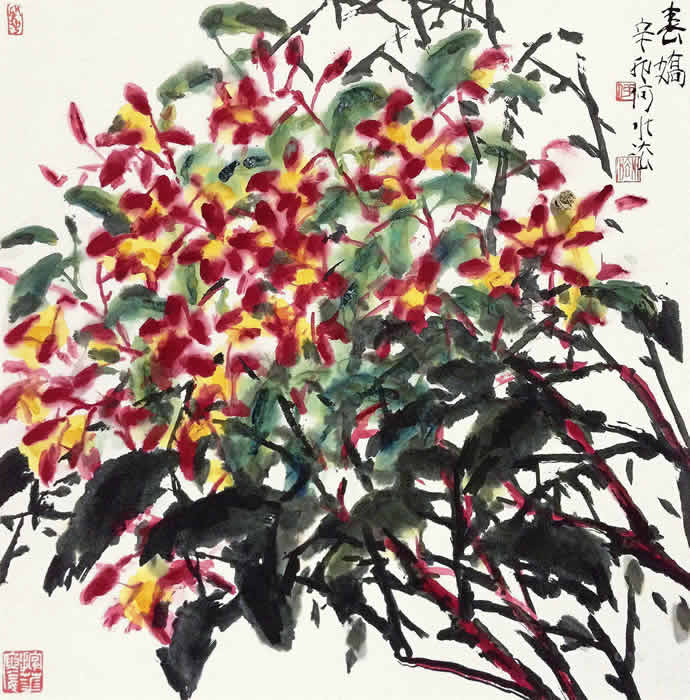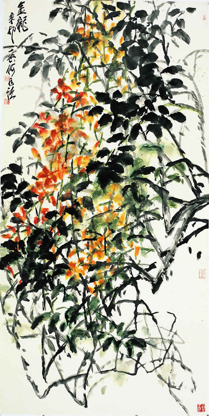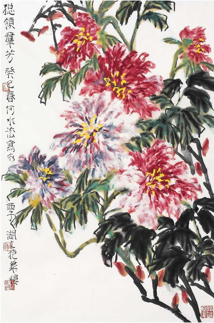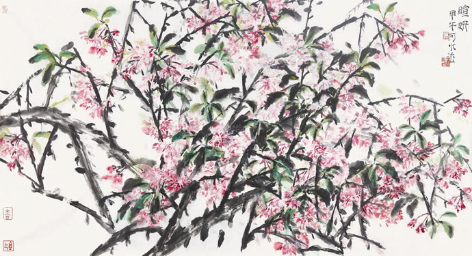 是幅作品为何水法2010年作《 暄妍》,尺寸为:96×177cm,早在2014年就拍出了207万的高价,为何水法目前最高成交价作品。此幅《暄妍》,笔墨酣畅淋漓,意境雍容博大,色彩绚丽而雅逸,可谓何水法写意花鸟的代表作品。