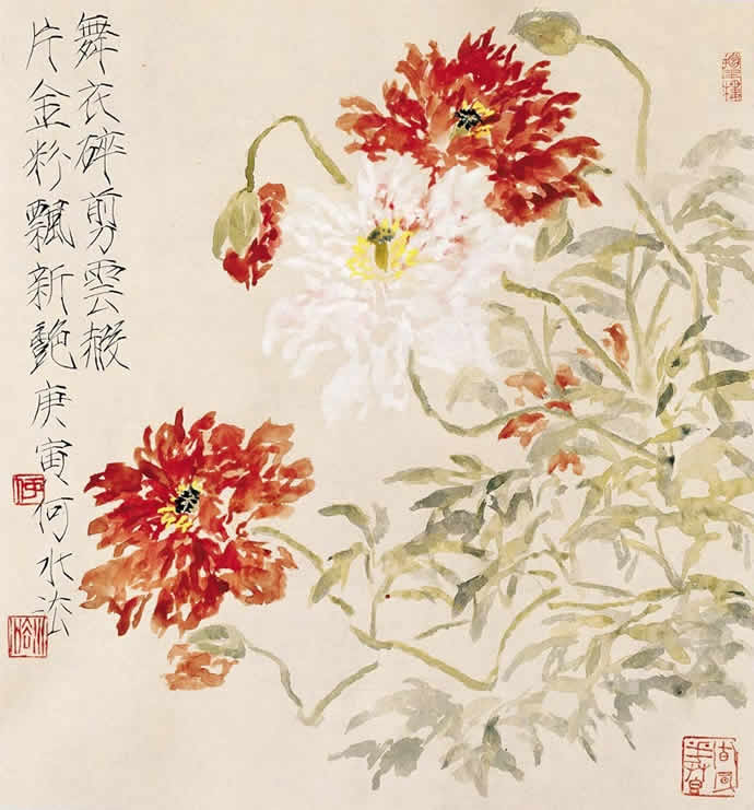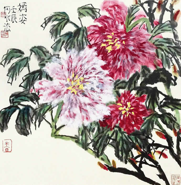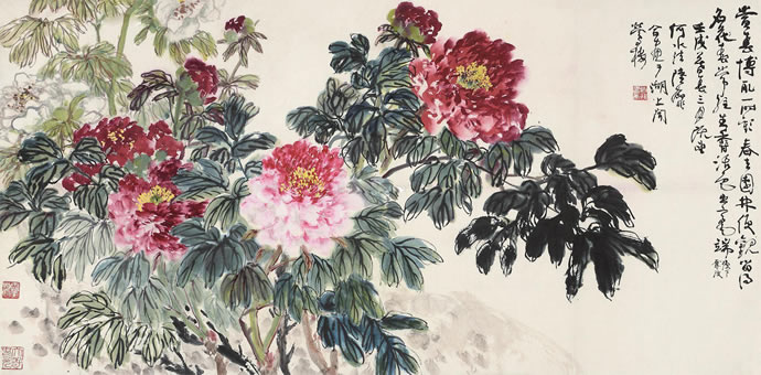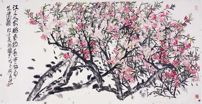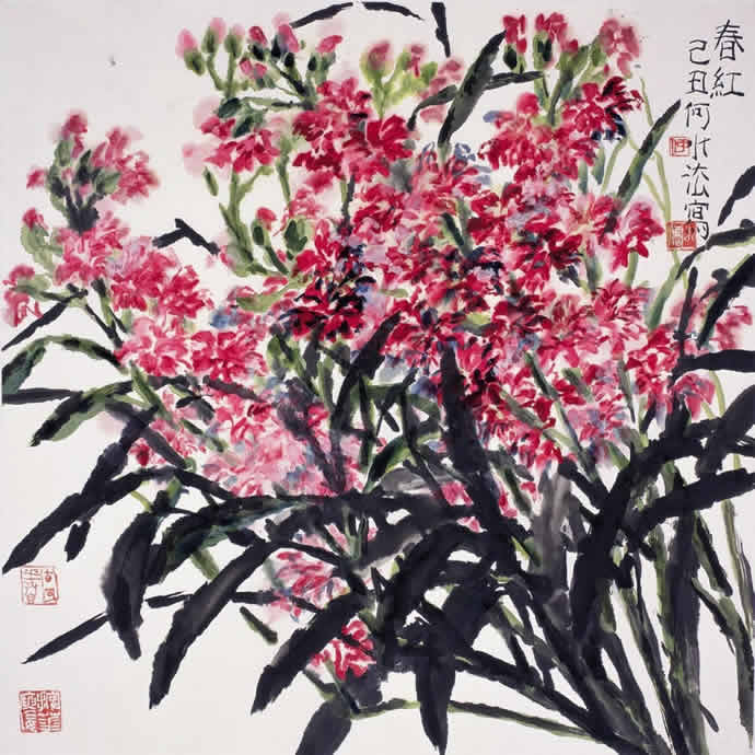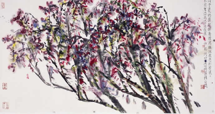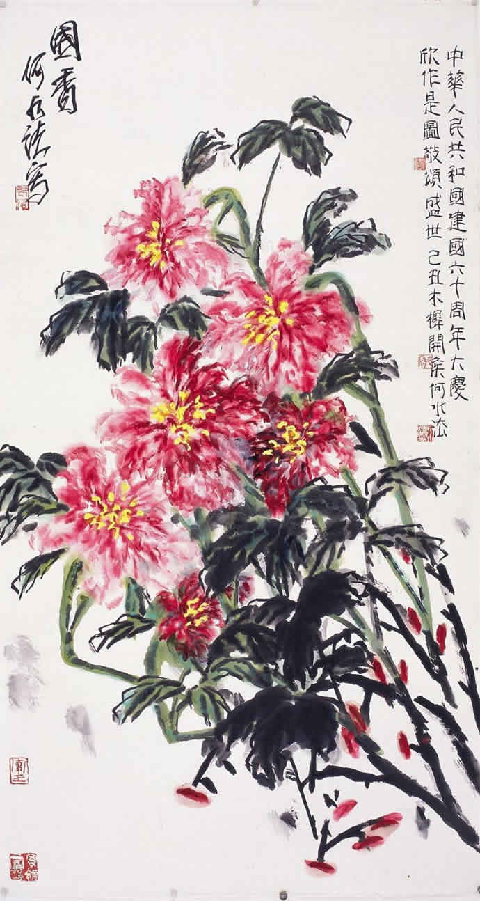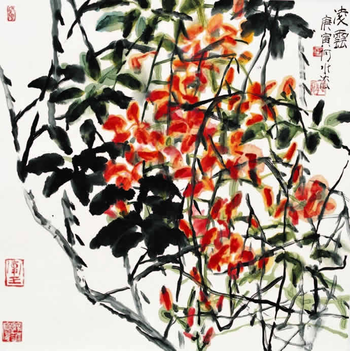 是幅作品为何水法2010年作《 暄妍》,尺寸为:96×177cm,早在2014年就拍出了207万的高价,为何水法目前最高成交价作品。此幅《暄妍》,笔墨酣畅淋漓,意境雍容博大,色彩绚丽而雅逸,可谓何水法写意花鸟的代表作品。