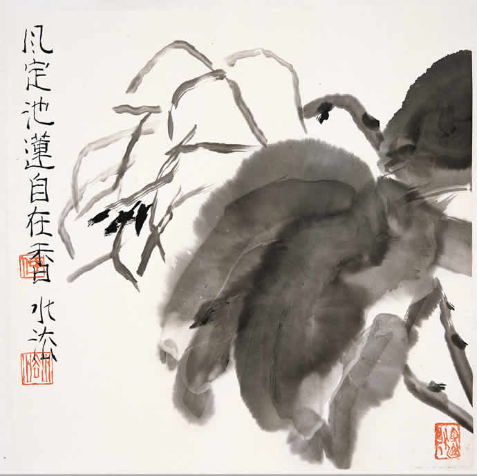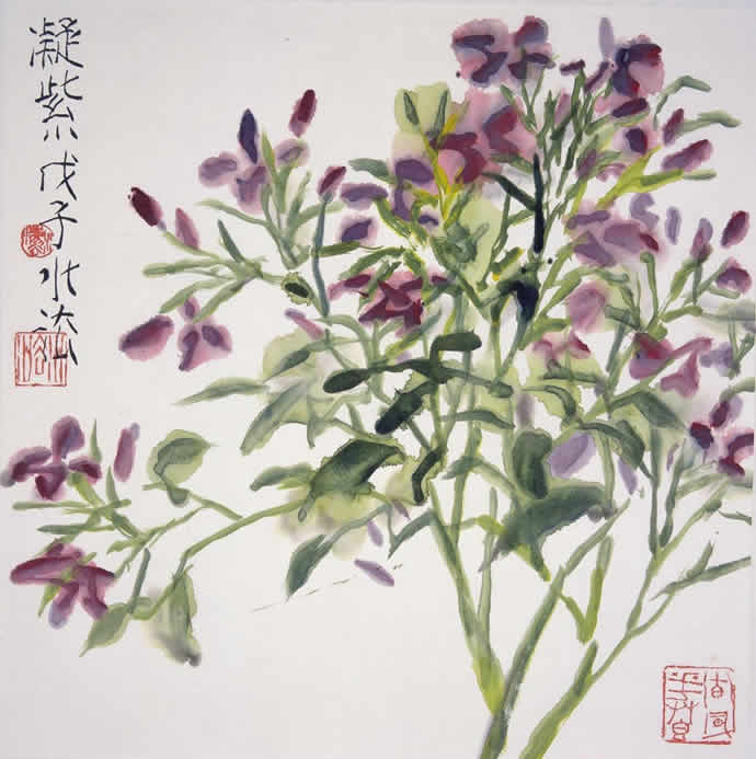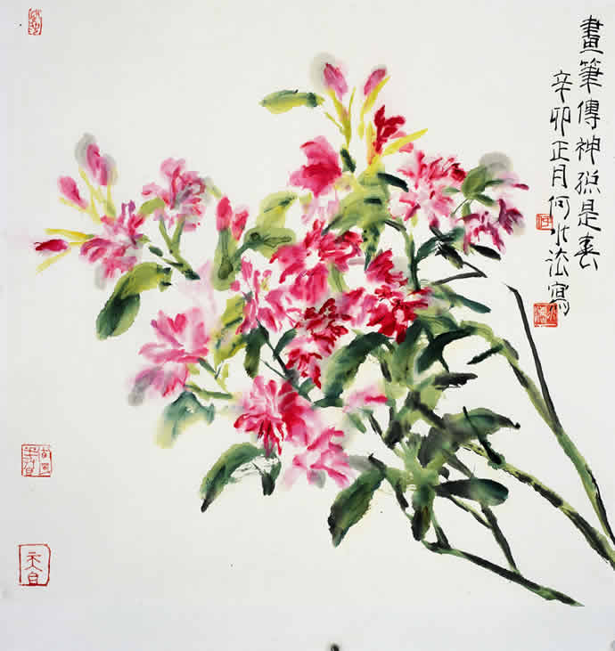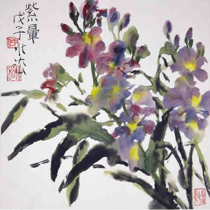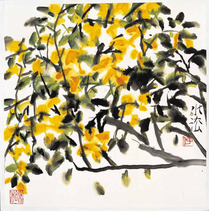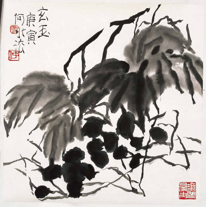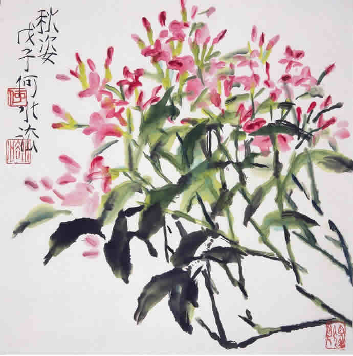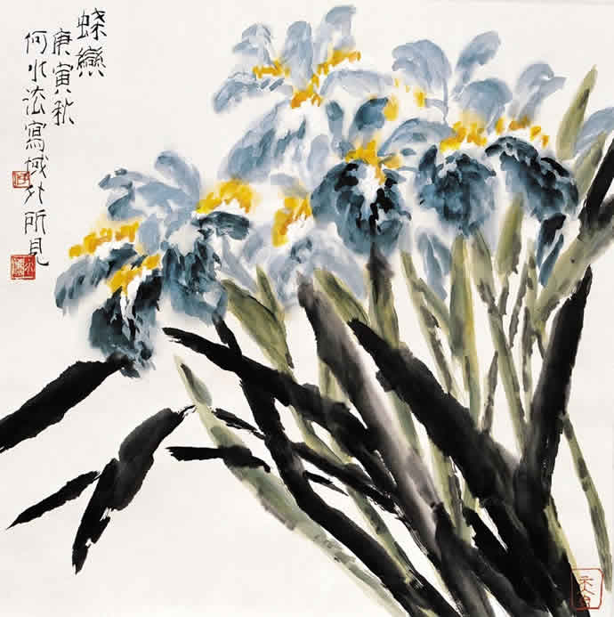 何水法曾对两宋的花鸟画作过精深的研究,因此,他的工笔花鸟结构严谨,用笔圆润自如,设色典雅秀逸,写意则受青藤、八大之影响,因而所作写意花鸟气旺神畅,笔墨华滋,浑然天成,厚实灵动,相映成趣。