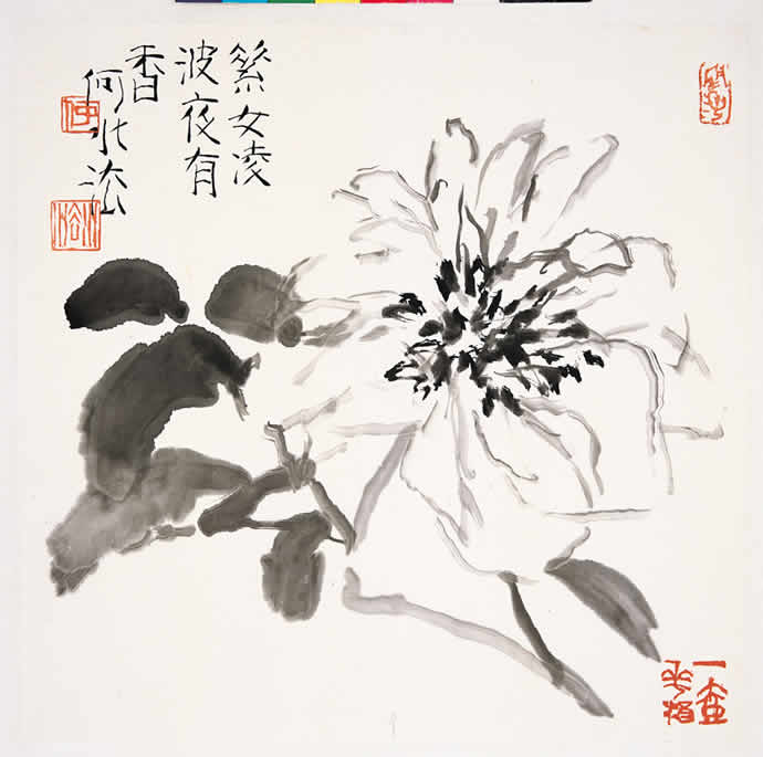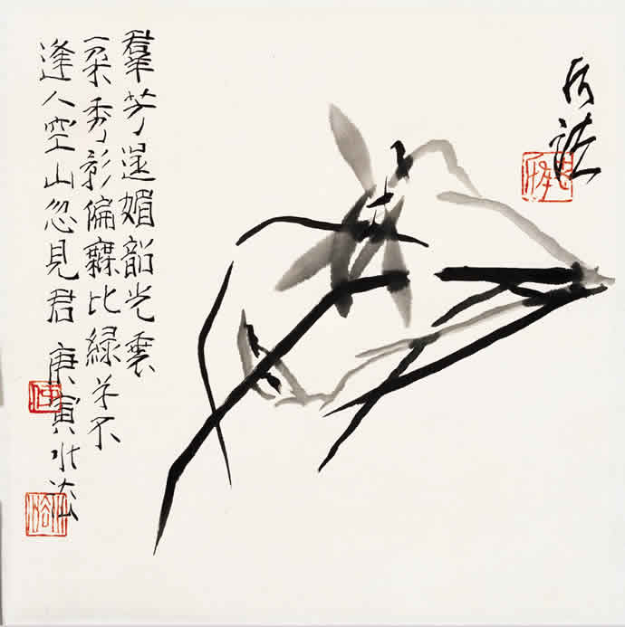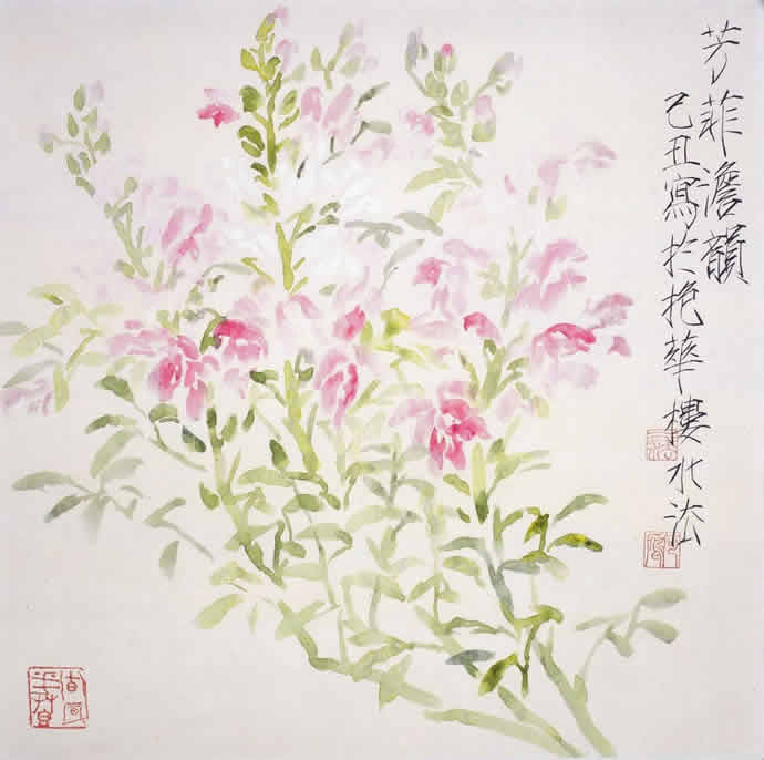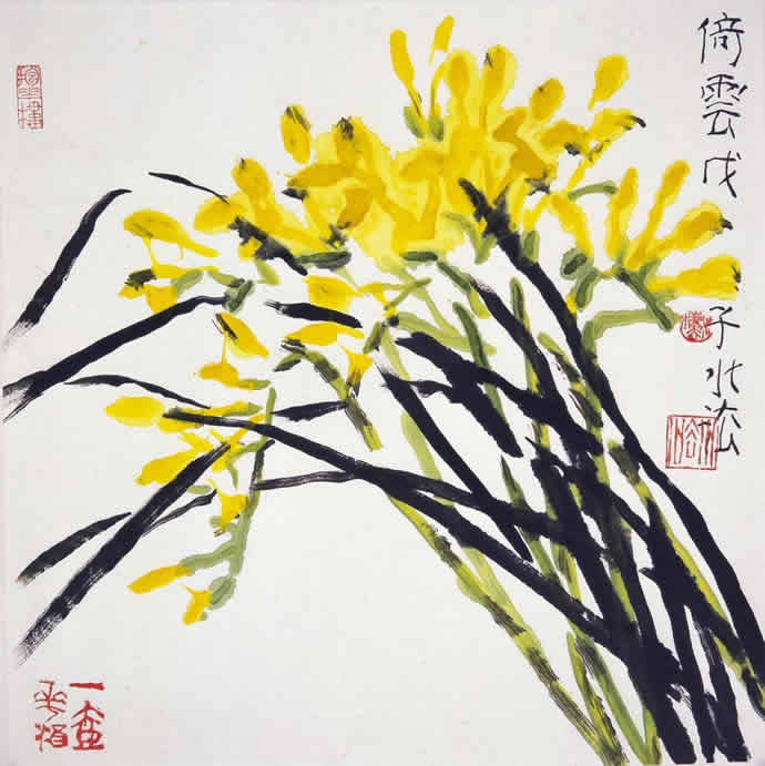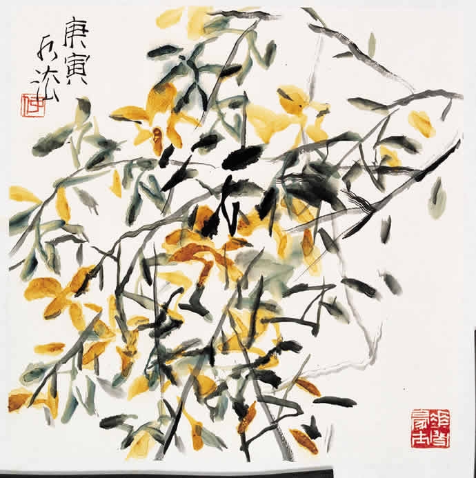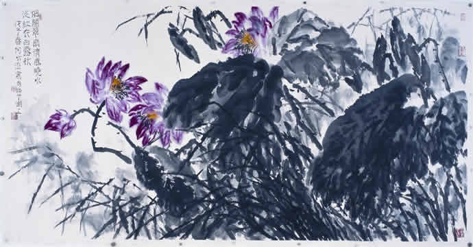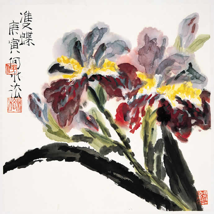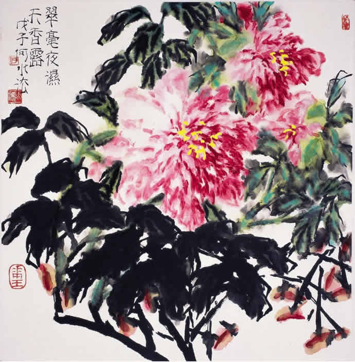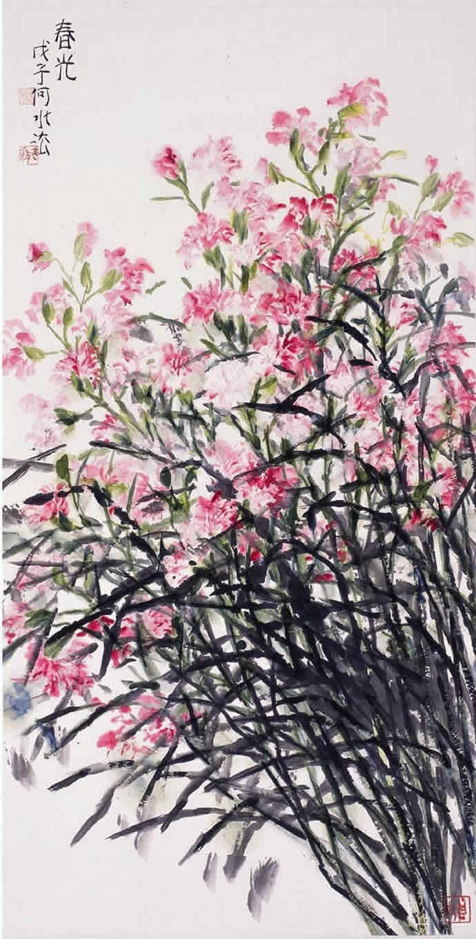 何水法曾对两宋的花鸟画作过精深的研究,因此,他的工笔花鸟结构严谨,用笔圆润自如,设色典雅秀逸,写意则受青藤、八大之影响,因而所作写意花鸟气旺神畅,笔墨华滋,浑然天成,厚实灵动,相映成趣。
