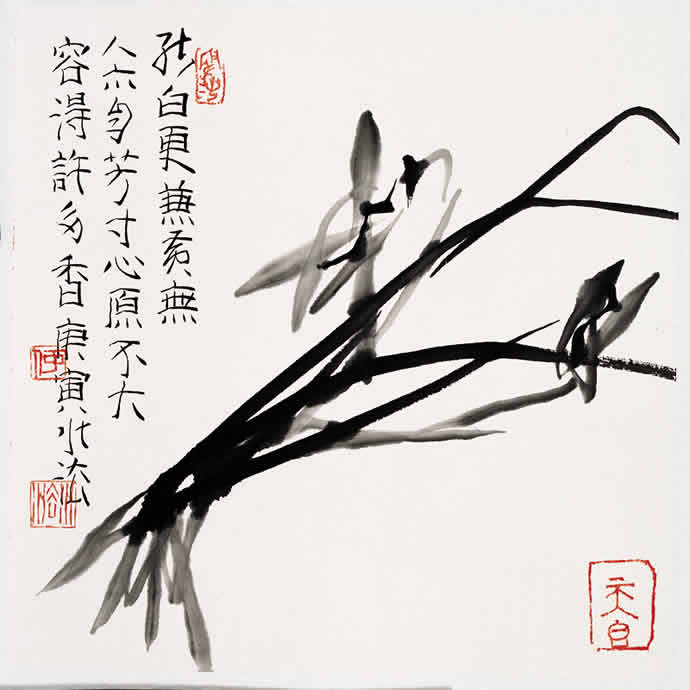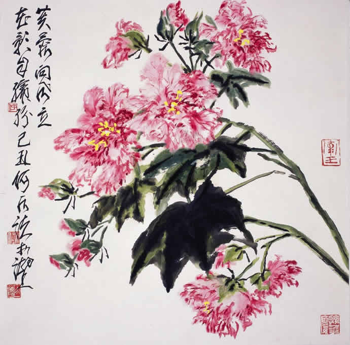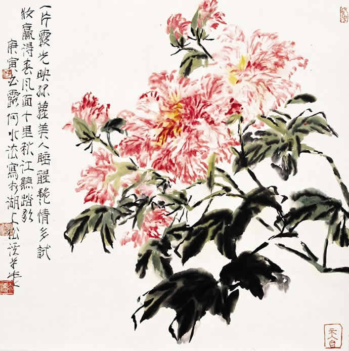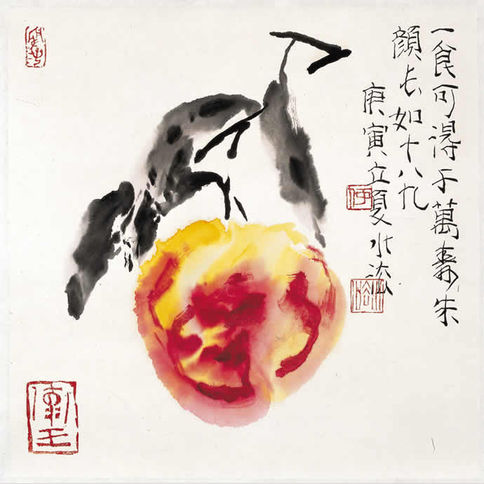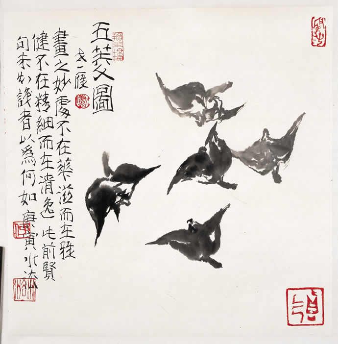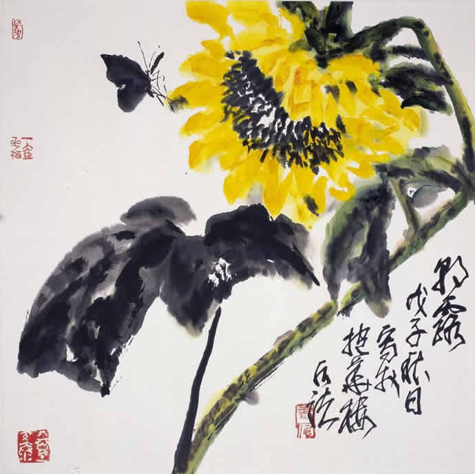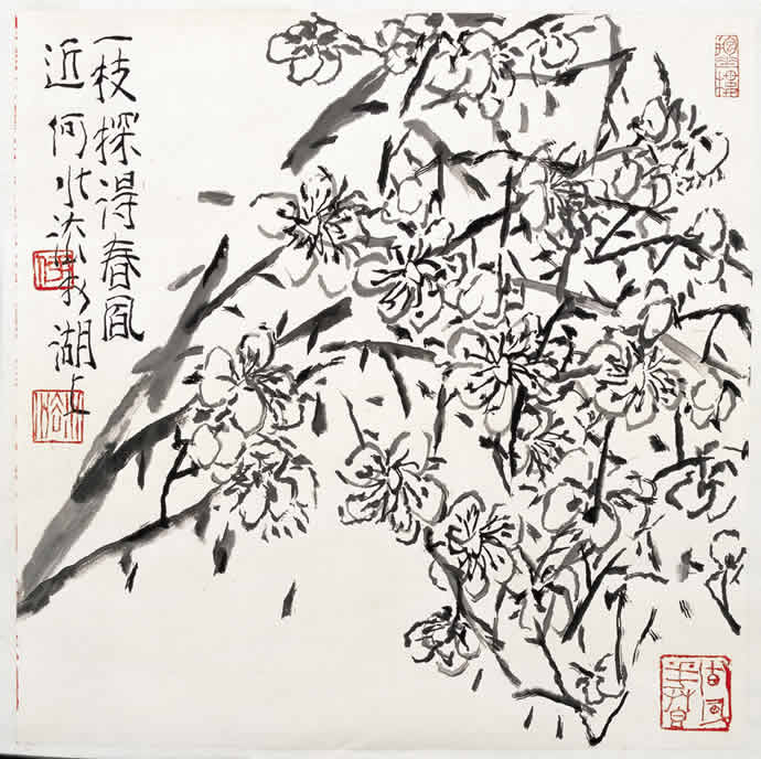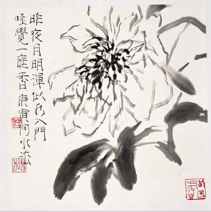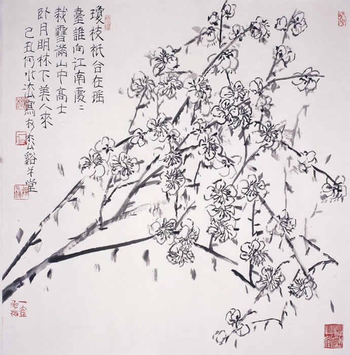 何水法曾对两宋的花鸟画作过精深的研究,因此,他的工笔花鸟结构严谨,用笔圆润自如,设色典雅秀逸,写意则受青藤、八大之影响,因而所作写意花鸟气旺神畅,笔墨华滋,浑然天成,厚实灵动,相映成趣。