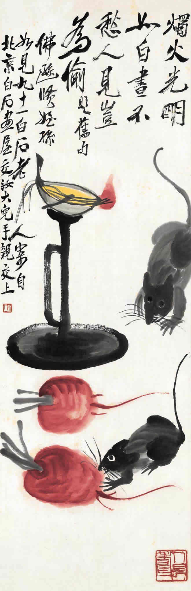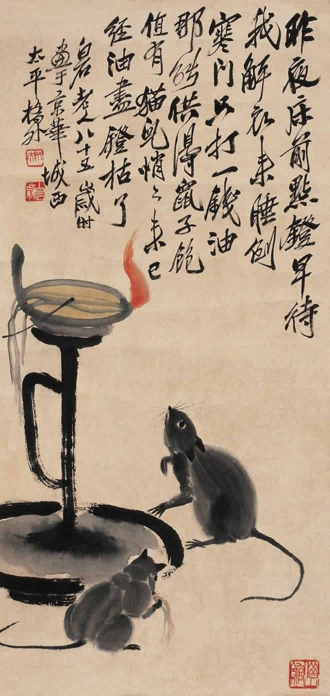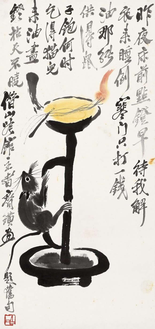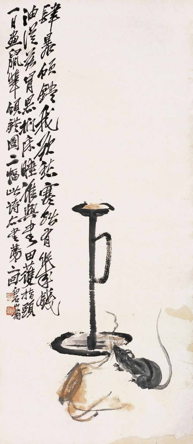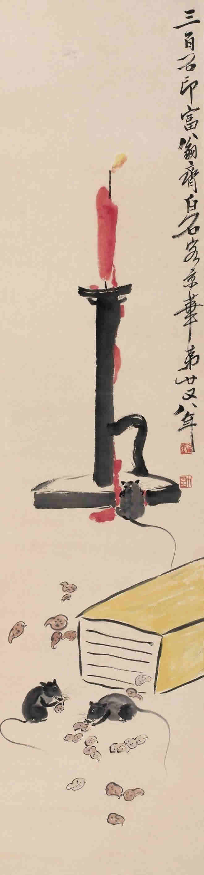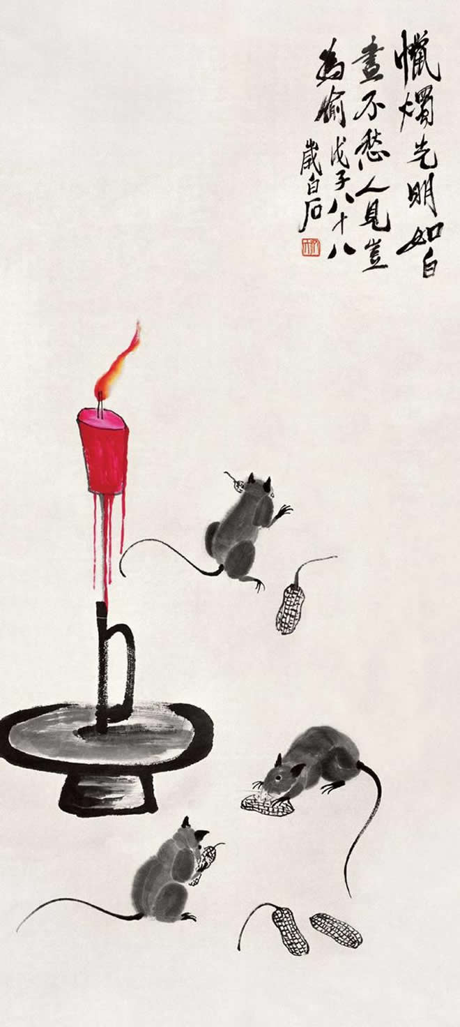 鼠是齐白石喜爱的题材。他画的小鼠,通常都与油灯、红烛及其它物象置于同一画面。在白石老人笔下,鼠通常被表现得机灵可爱,是一个顽皮的小精灵,虽然有时也干点坏事,如啮书、偷油,但那正像是一个贪玩的淘气孩子。这正表现出白石老人未泯的童心。