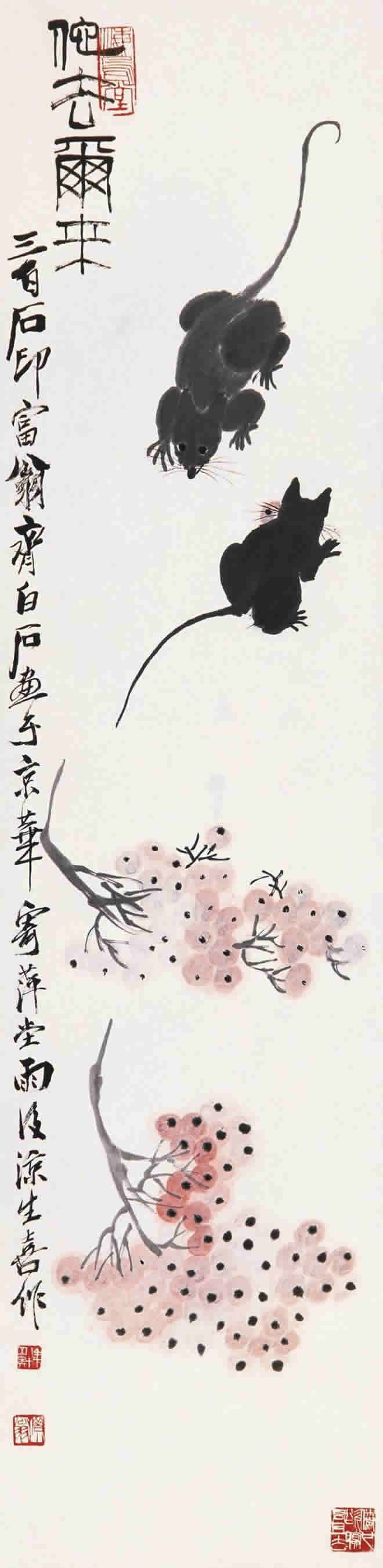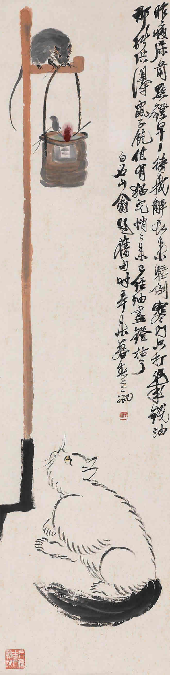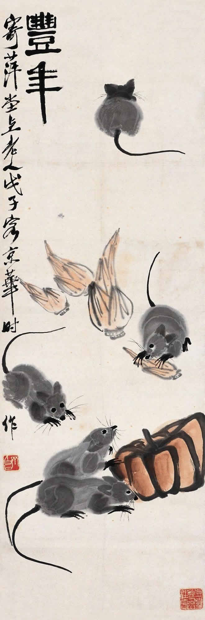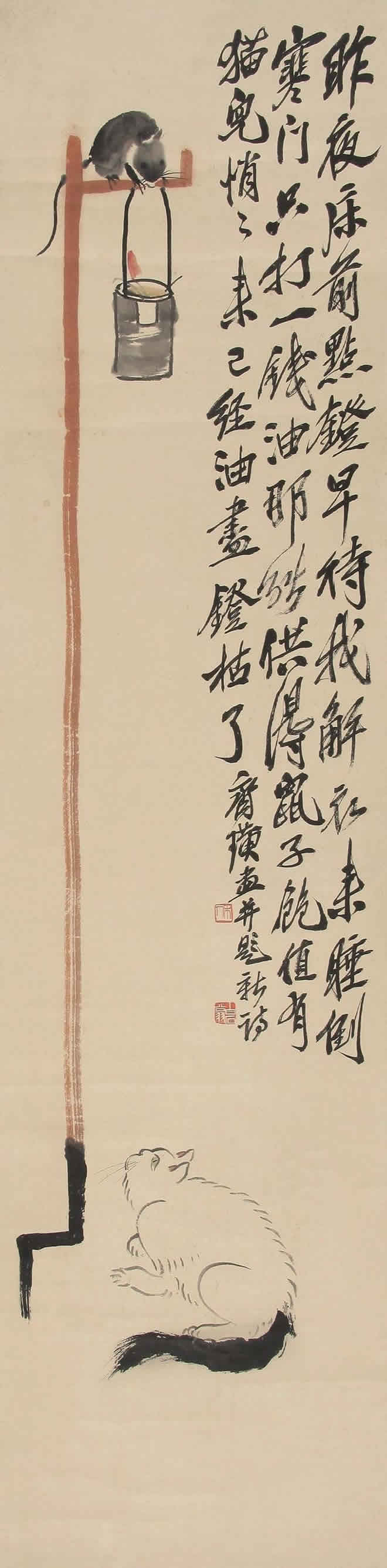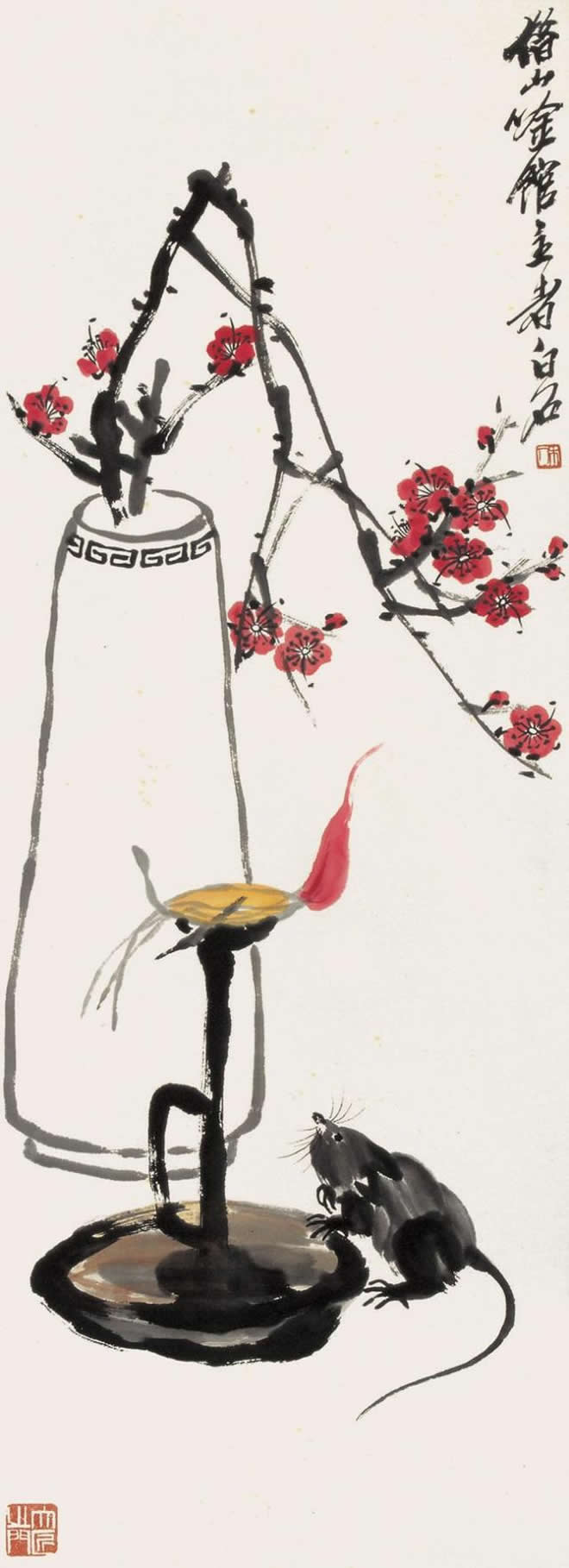 鼠是齐白石喜爱的题材。他画的小鼠,通常都与油灯、红烛及其它物象置于同一画面。在白石老人笔下,鼠通常被表现得机灵可爱,是一个顽皮的小精灵,虽然有时也干点坏事,如啮书、偷油,但那正像是一个贪玩的淘气孩子。这正表现出白石老人未泯的童心。