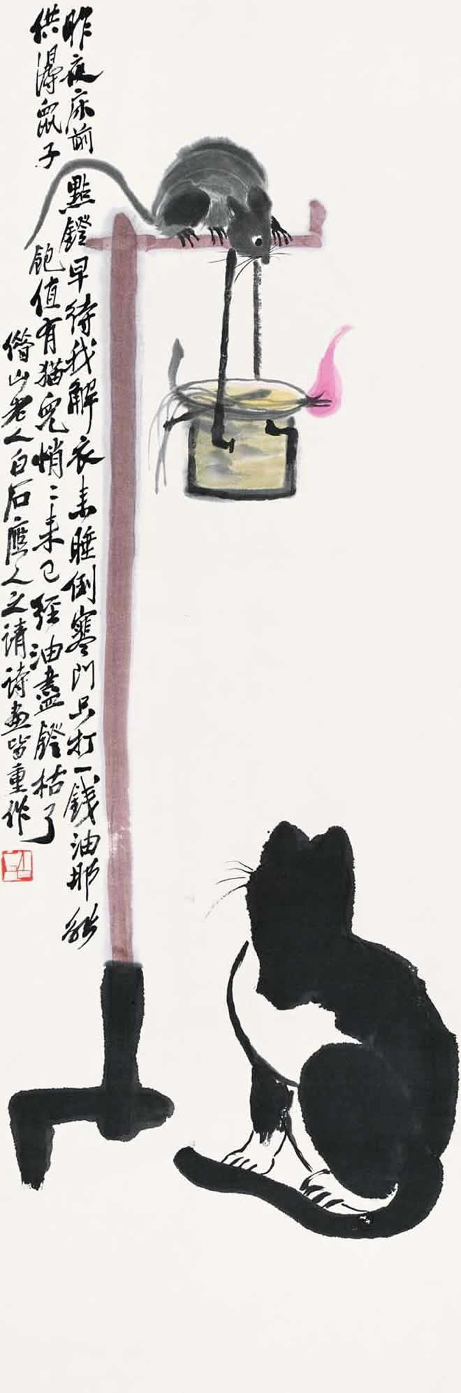 齐白石画笔下的烛台鼠戏