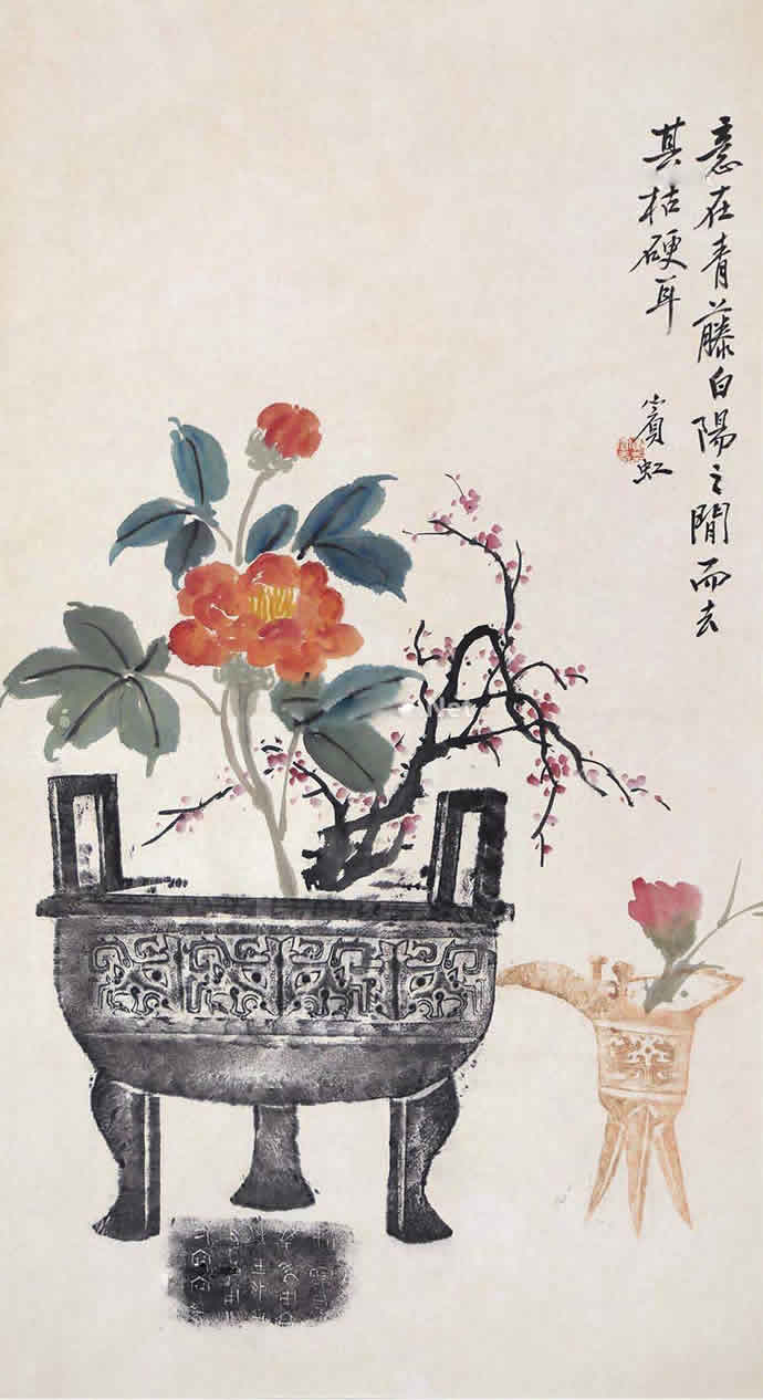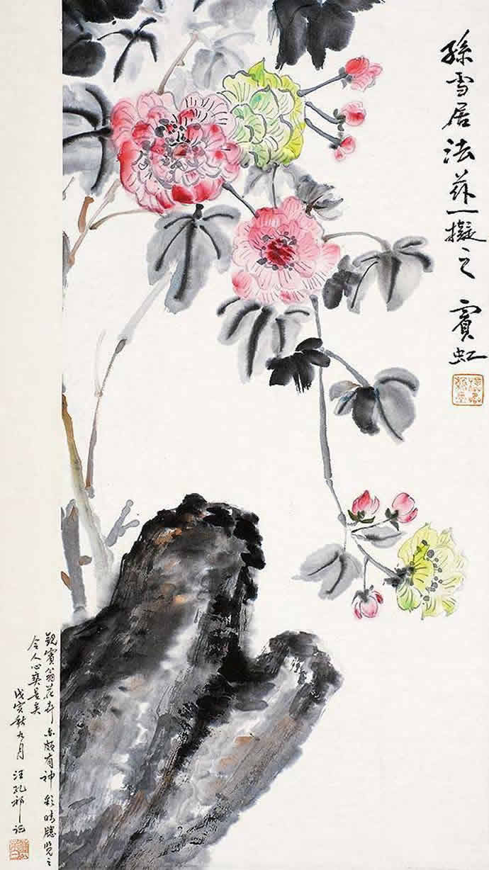 众所周知,黄宾虹擅画山水,为山水画一代宗师。所谓黑宾虹“黑、密、厚、重”的画风,正是他显著的特色。但少有人知道早年曾从郑珊,陈崇光等学花鸟。今年10月17日,黄宾虹的一幅花卉作品(长45cm;宽60cm)在香港派出了1969.82万的高价,成为黄宾虹花卉最高成交价作品。