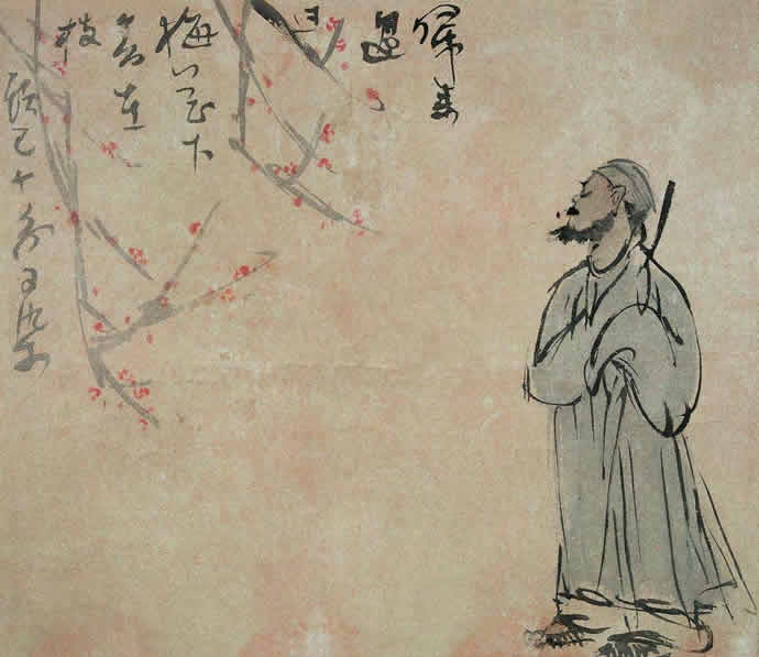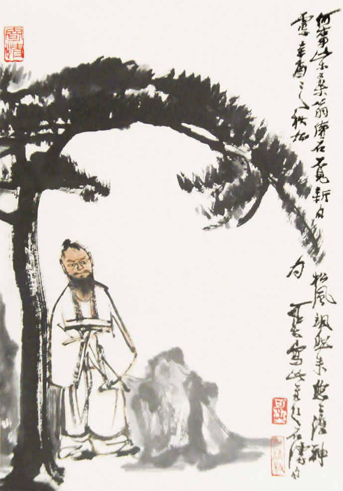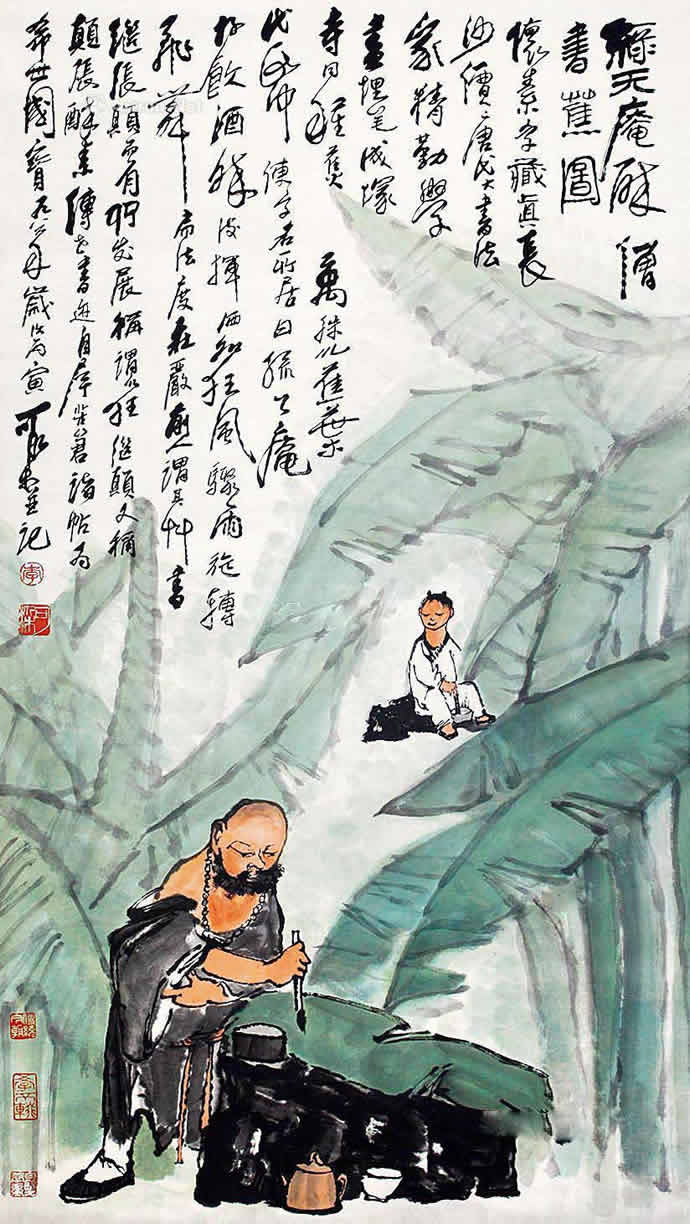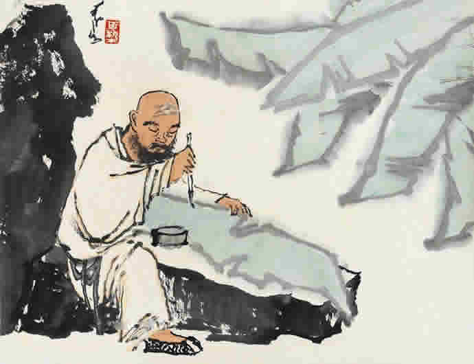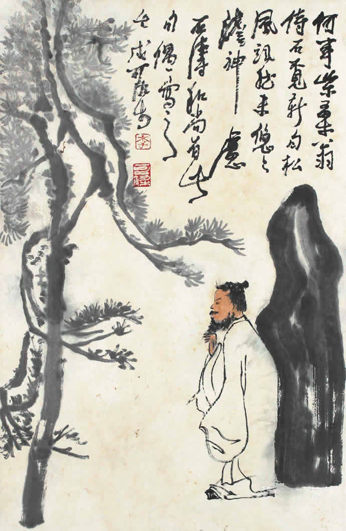 李可染的人物画在表现手法上早期采用简笔、意笔的方式,用笔潇洒放逸,中期笔墨趋于沉着、厚重,到晚期则笔墨老辣、无羁;题材上从文人情趣转向于描绘现实人生继而到抒发自己的人生理想、艺术追求。从李可染早期的《钟馗》,1949 年的《街头卖唱》、1960 年的《赏荷图》到80 年代的《布袋和尚》、《苦吟图》等可窥见其整个艺术人生中的人物画创作部分。