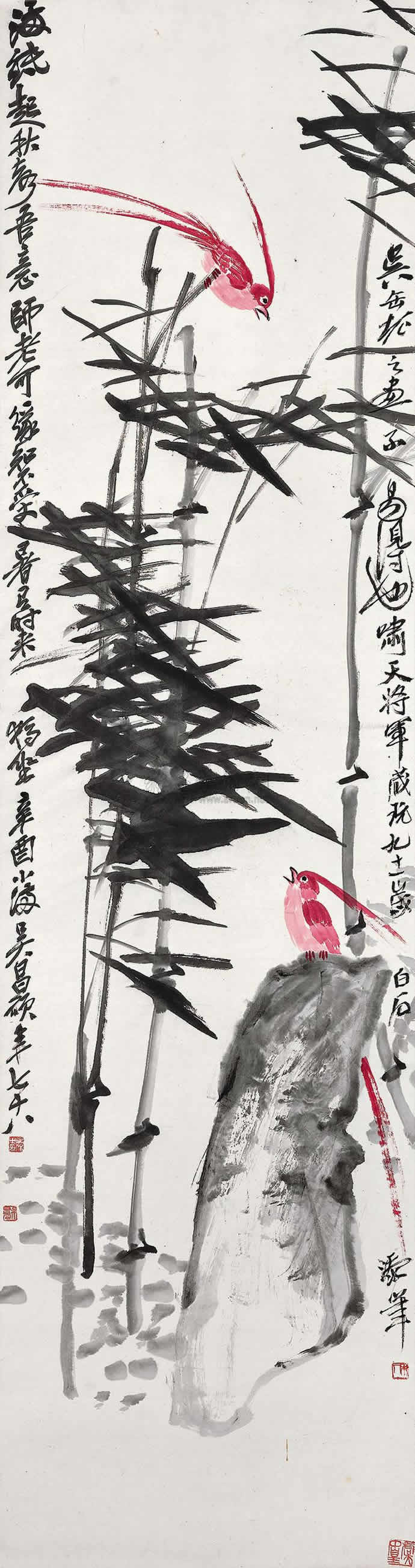 荣宝斋(上海)2011年11月举办的首场大型艺术品拍卖会上,一幅吴昌硕和齐白石合作的《竹石双寿》(见下图)立轴,拍前估价1200万—1800万元,最终成交价为3162.5万元。在北京翰海2011秋季拍卖会上,一幅郑板桥《竹石图》立轴,以3795万元成交。