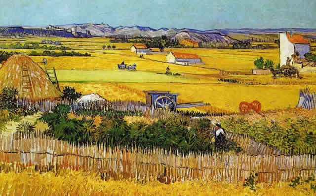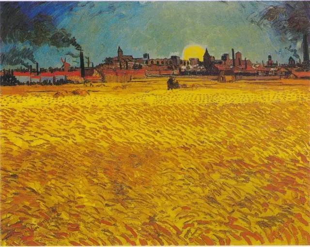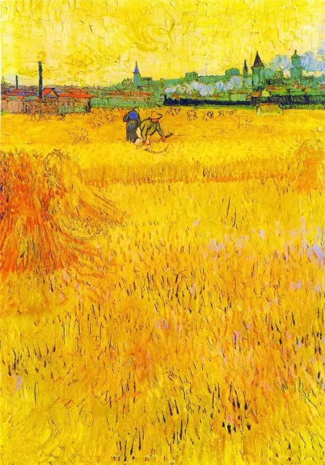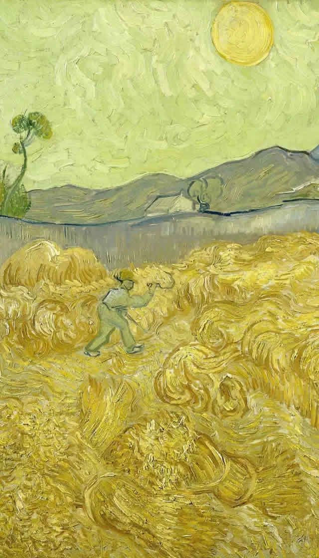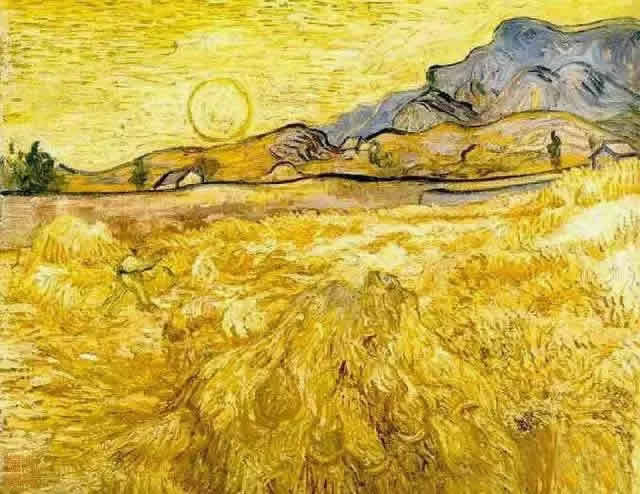 这是梵高非常有意境的作品,是在法国的一个精神病疗养院里创作的。太阳像个大的咸蛋黄,天空有点发绿,山丘却是蓝色的,从低到高,拉成一条斜线,稀疏的坐落着几个简陋的房子,大面积金黄的麦田,麦浪随风翻滚着,好个丰收的秋天,可只有一个人挥舞着镰刀在收割。