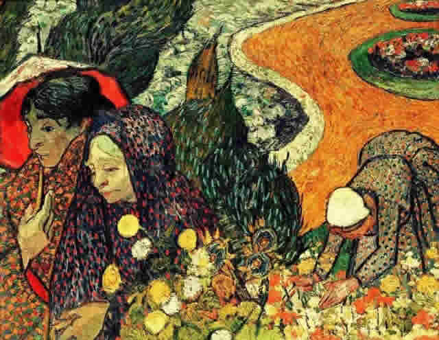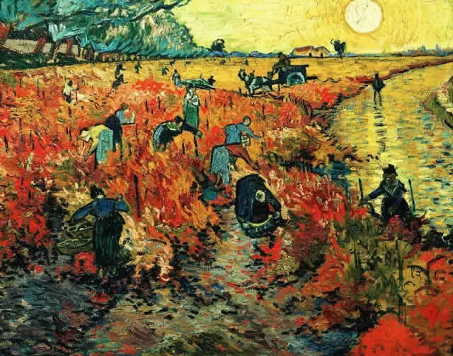 普照的阳光,火一般的光线的扩散,血红色的葡萄园,热情和精张的色调的炽热。梵高希望在他作品中为我们画出酒的酵素和醉意,令人发狂的热气腾腾。色彩中的喧闹性暗示了无节制的狂欢,葡萄园被看作是异常的促进者和主要的源泉。