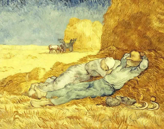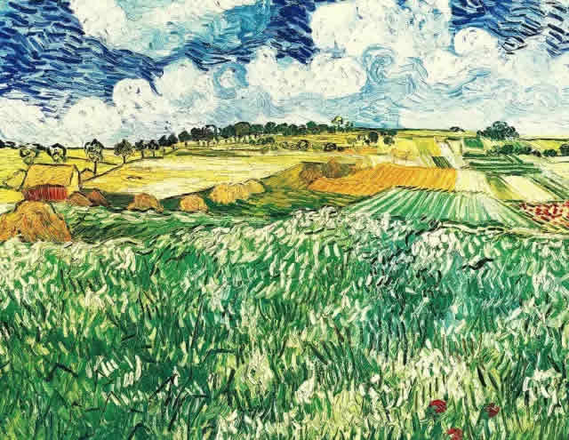 这幅画很能代表凡高抽象派的画法,笔触非常简单,直线、点、圆圈,那收割者甚至有点丑陋,可是色彩却如此浓烈,金色的麦浪好漂亮,蓝色的山丘绵延着,太阳在最上端跟麦田呼应着,一种凄楚的美。
