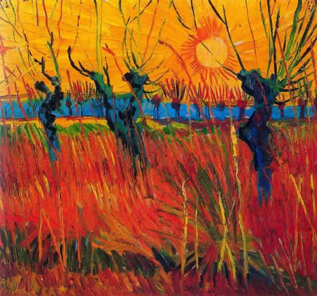 梵高早期只以灰暗色系进行创作,色调比较低沉。直到他看到了日本浮世绘以及在巴黎遇见了印象派与新印象派,融入了他们的鲜艳色彩与画风,创造了他独特的个人风格。画面变得响亮和明朗,好象要用欢快的歌声来慰藉人世的苦难,以表达他强烈的理想和希望。