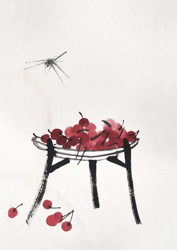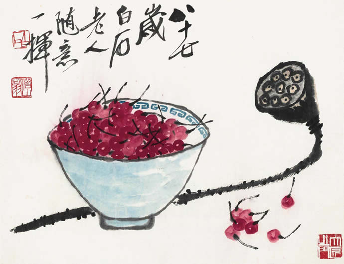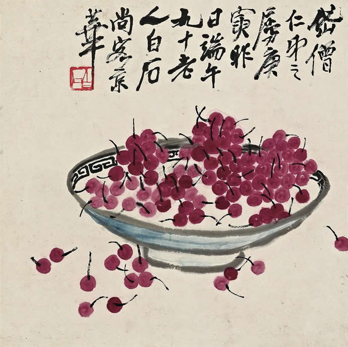齐白石画樱桃的作品很多,但这一幅作品最好,一只青瓷盘盛满了刚刚摘下的红樱桃,还有数十颗滚落盘外。显然,画外之意是主人在樱桃熟了的初夏,见到了远道来访的好友,欣喜之情溢于言表,赶忙选了一大盘鲜红的樱桃,急急端上桌子,以至于慌乱中散落一桌。因此,这幅没有画上人物的《樱桃》,实际上画足了人的友情,画出了主人的热心肠。
