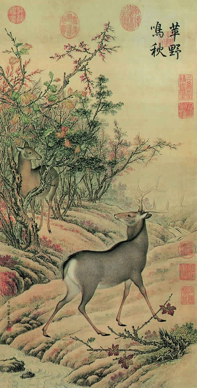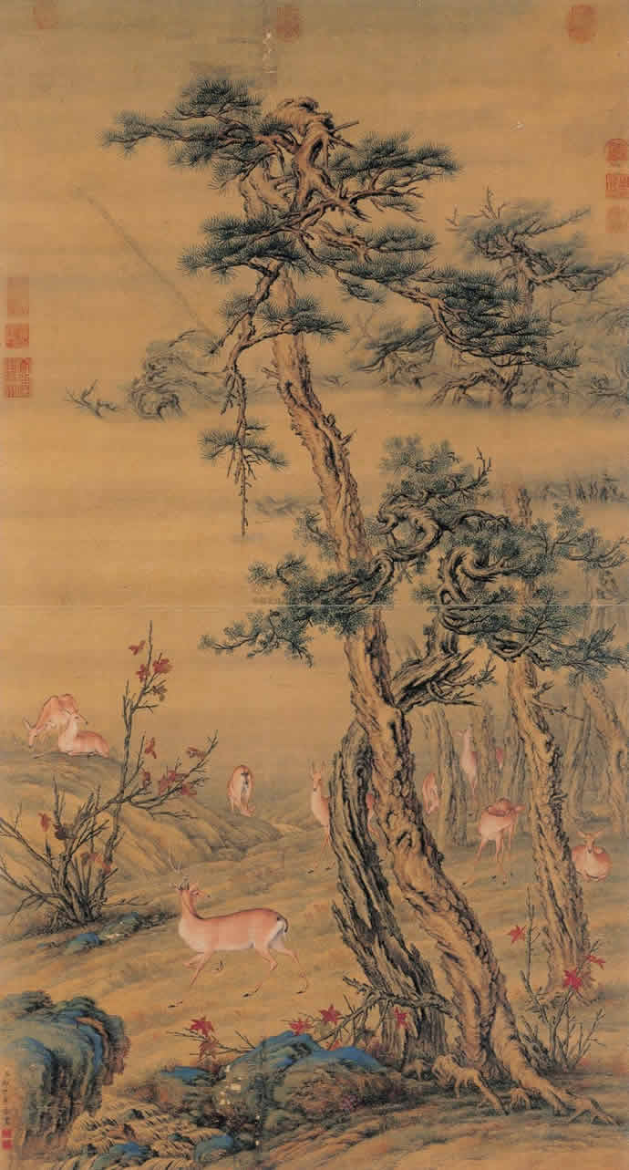 7、郎世宁 秋林群鹿图 立轴 设色绢本