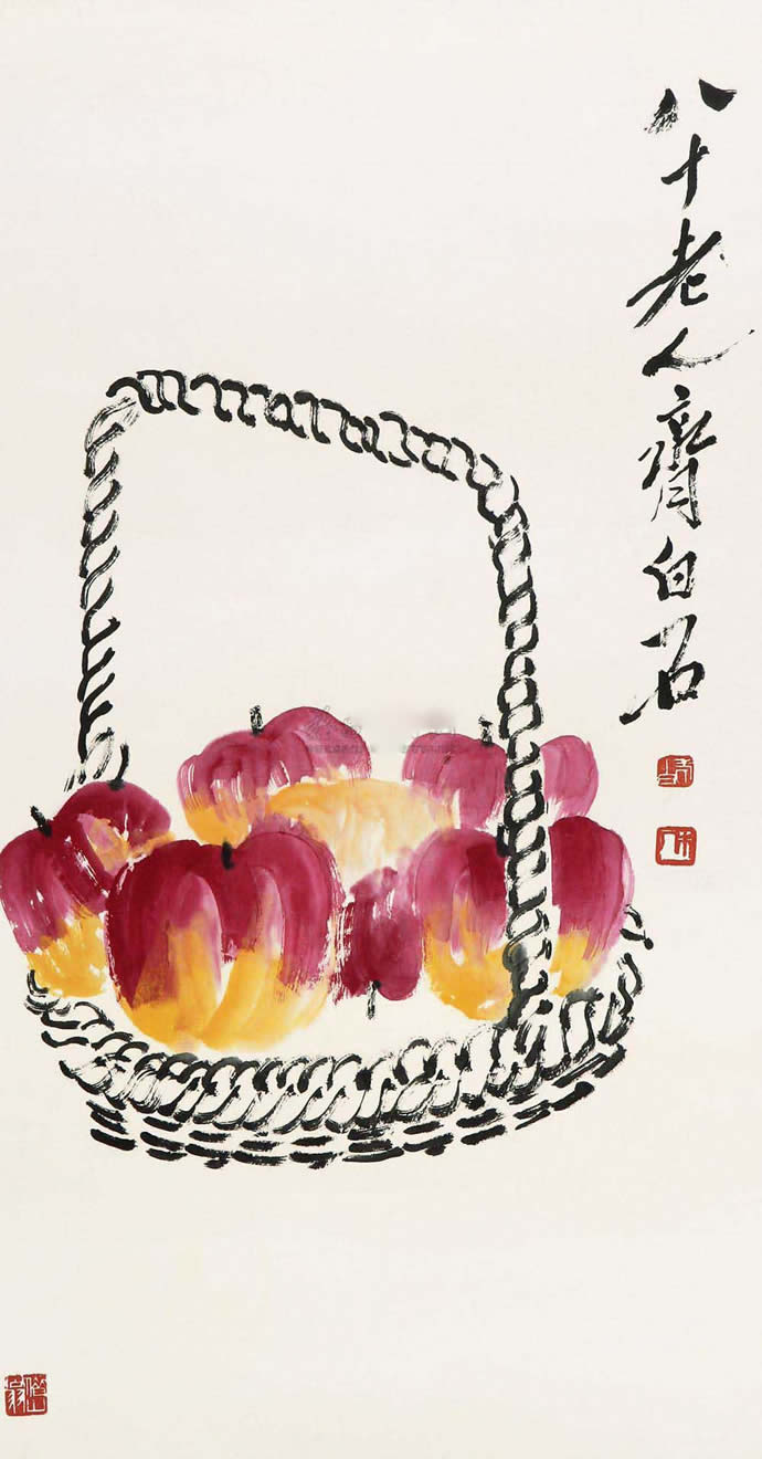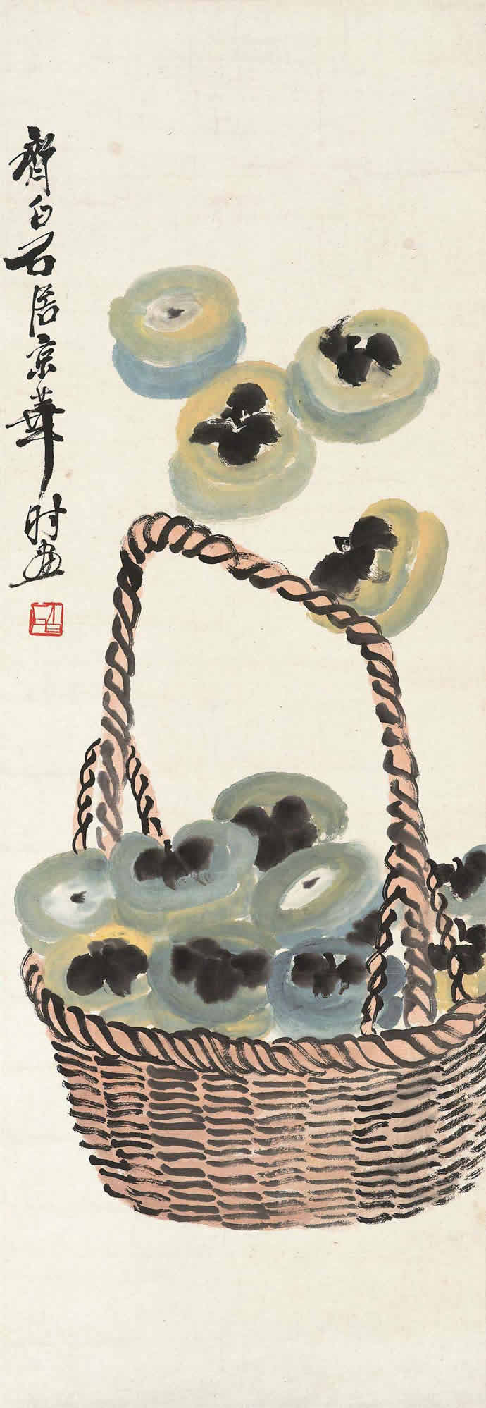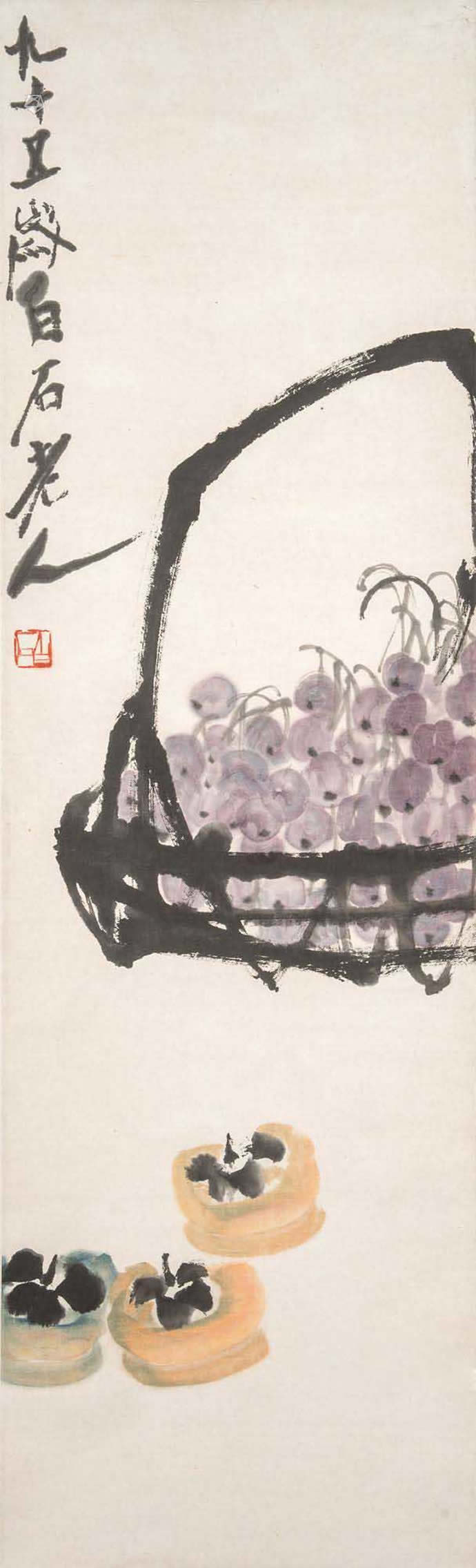 △齐白石 1955年作 竹篮葡萄三柿图