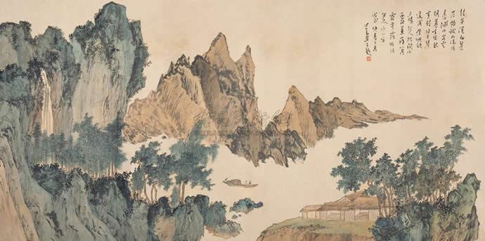 · 傅儒 秋山泛舟 立轴 设色纸本