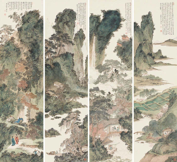 · 傅儒 己卯(1939)年作 碧山秀水四景屏 (四件) 屏轴 设色纸本