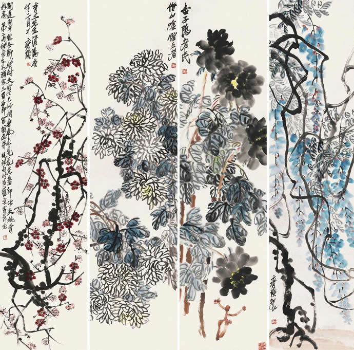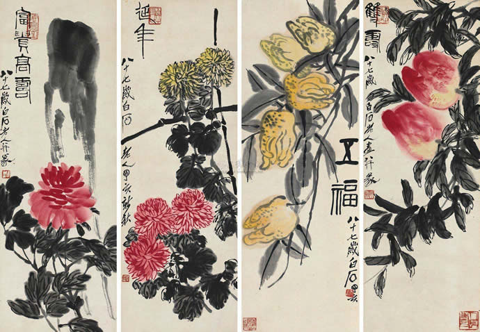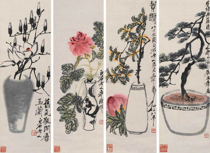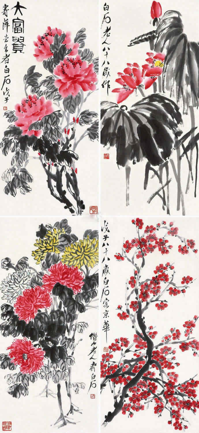 11、齐白石  1948年作 四季花卉 堂屏(四条) 设色纸本