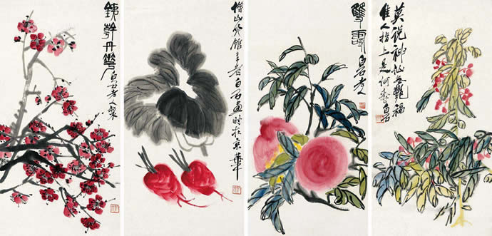 1、齐白石花卉 四屏 设色纸本