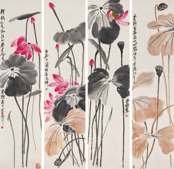 13、1923年作 群荷争妍 (四幅) 镜框 设色纸本