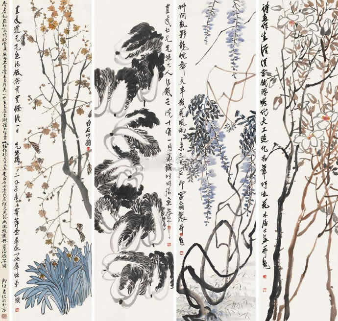 10、齐白石 甲子(1924年)作 花卉 四屏立轴 设色纸本
