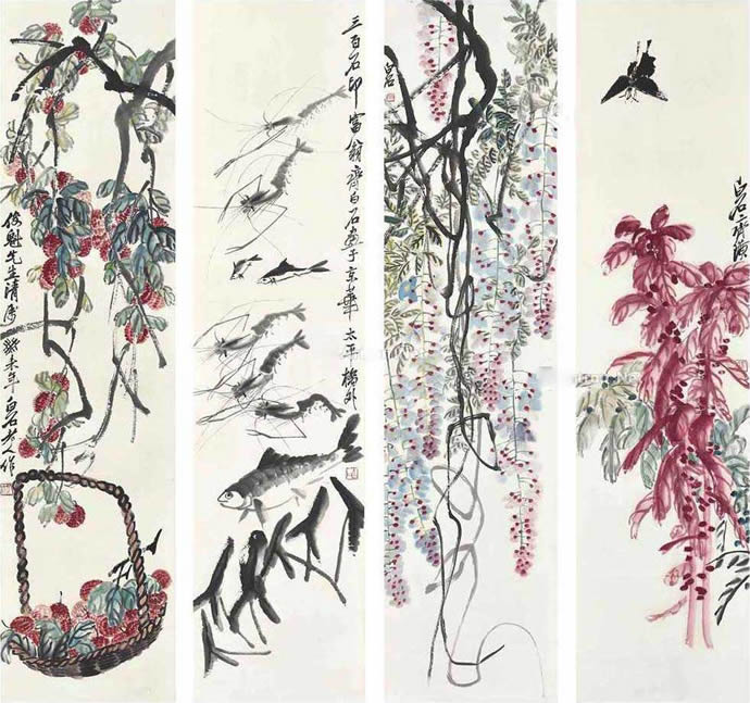 8、齐白石 1943年作 形神俱似 雁来红 紫藤 水族 荔枝 (四幅) 立轴 设色/水墨纸本
