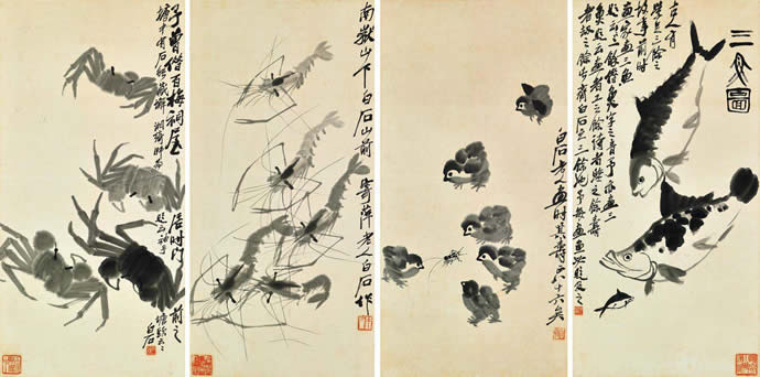 9、齐白石 水族小鸡 (四幅) 木框 水墨纸本