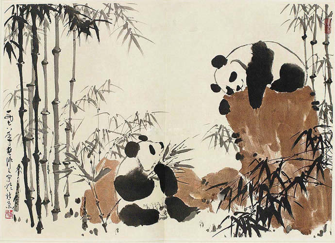 △吴作人萧淑芳合作 熊猫竹石图