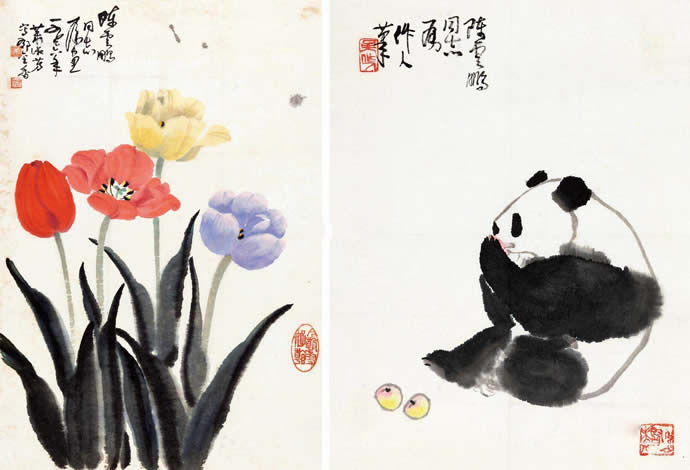 △吴作人萧淑芳 1976年作 熊猫 郁金香