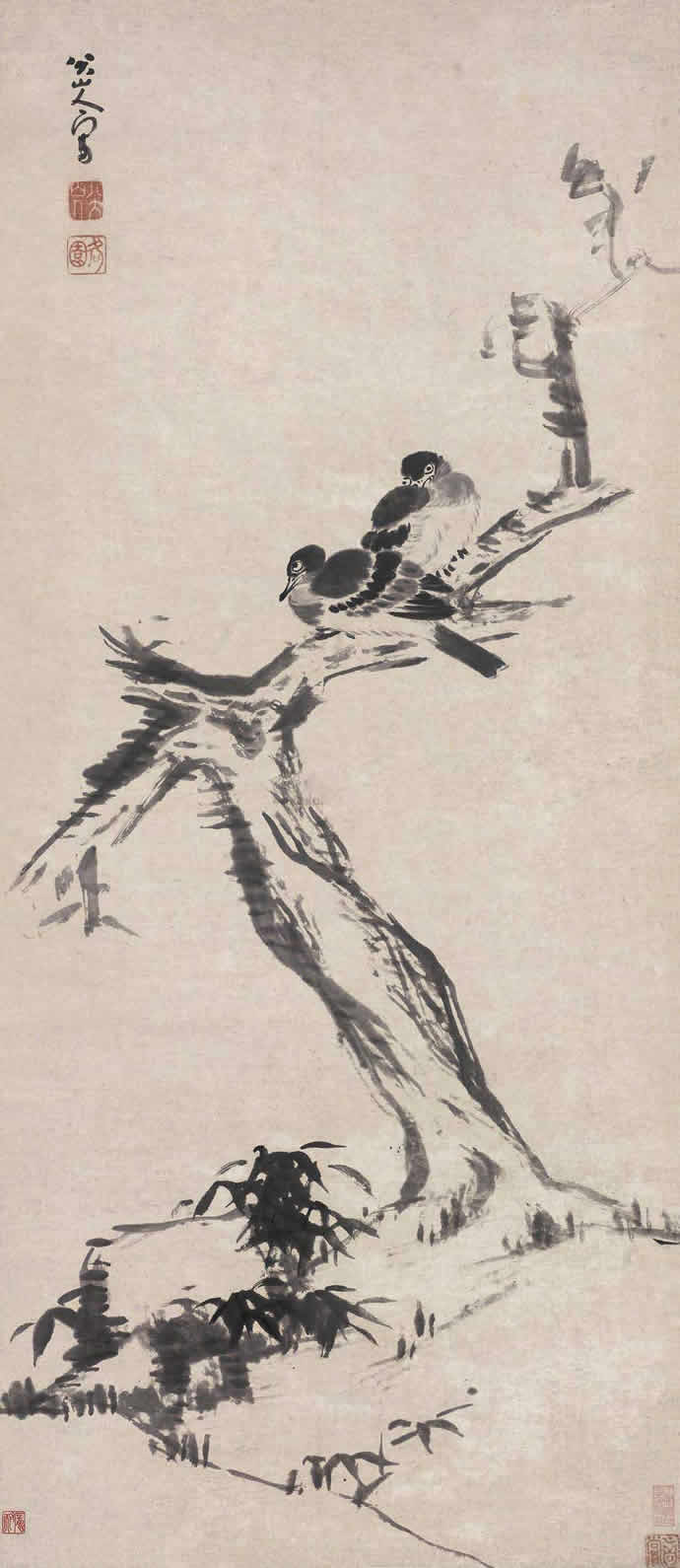 10、八大山人 古木双禽 立轴 水墨纸本