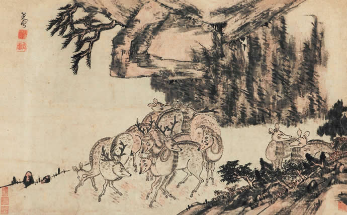 11、八大山人 群鹿图 立轴 设色纸本